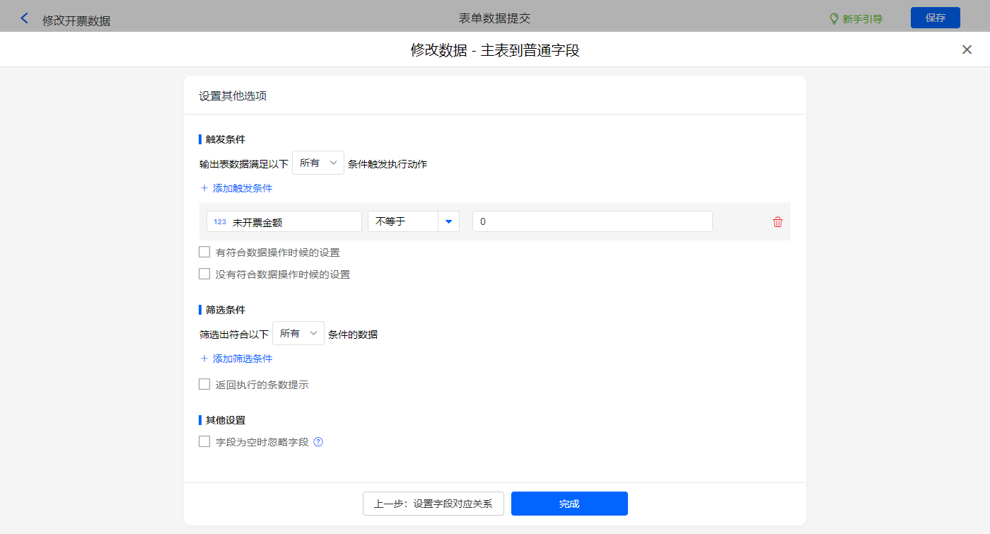 其他设置的触发条件为【未开票金额】等于0,设置好点击【完成】并保存该数据助手;