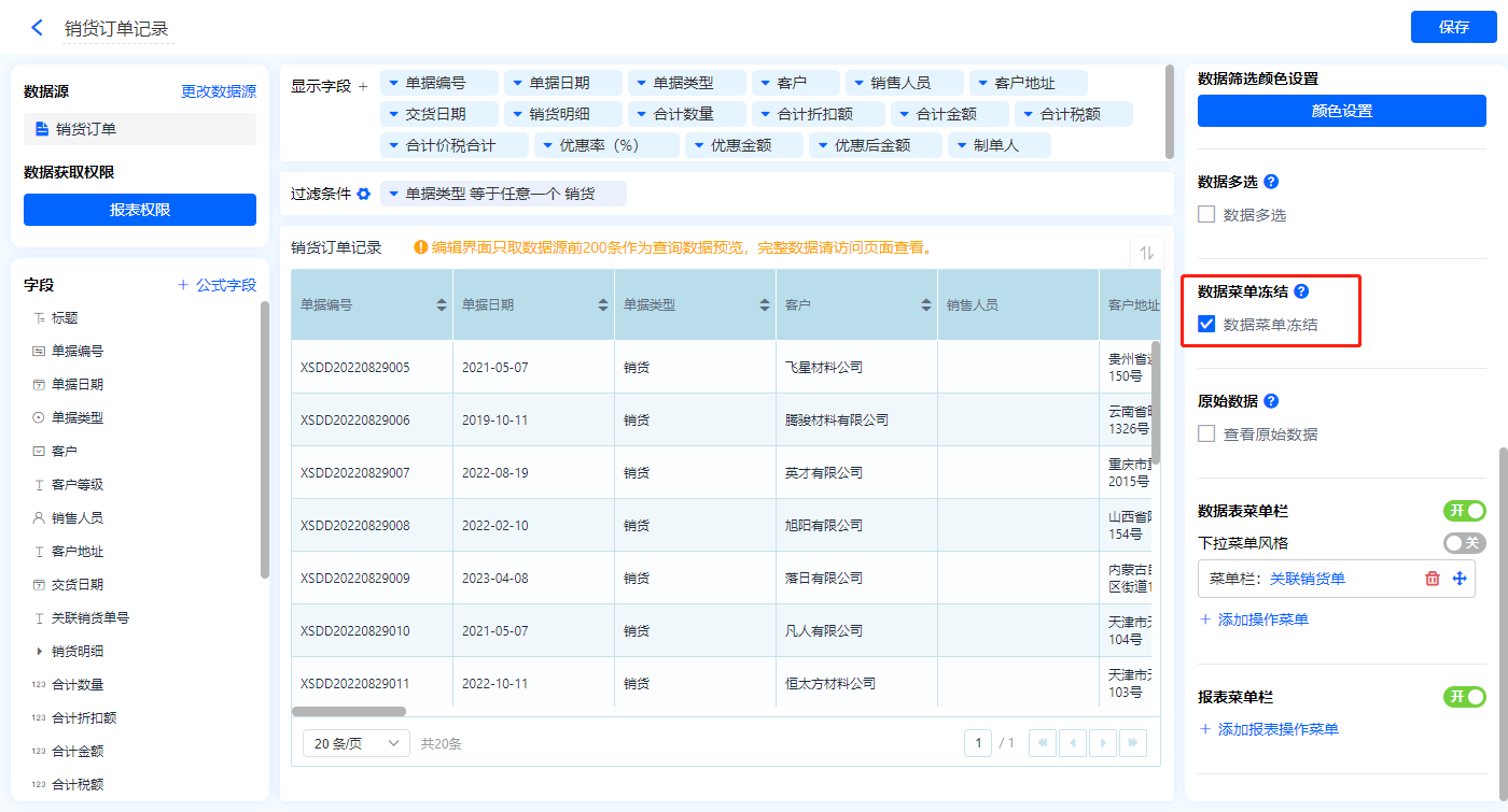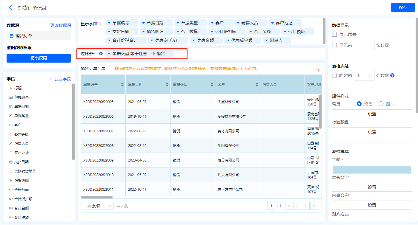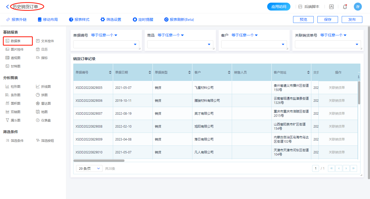 1)新增【历史销货订单】报表,用基础报表【数据表】展示数据源为表单【销货订单】的数据;