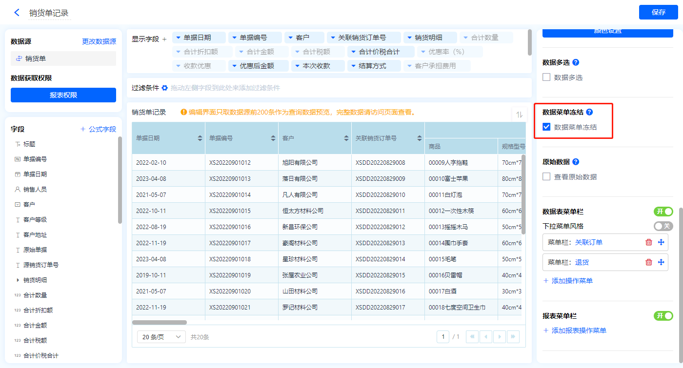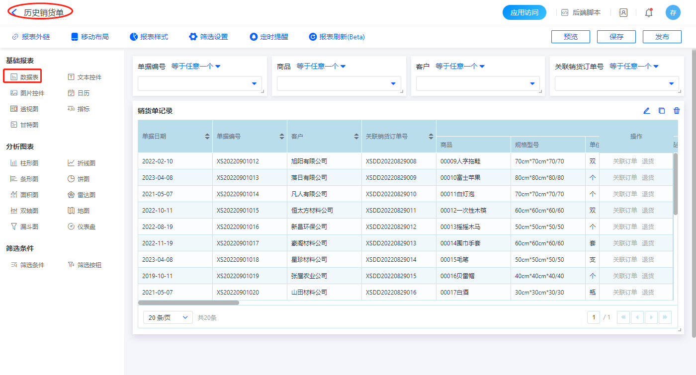 1)新增【历史销货单】报表,用基础报表【数据表】展示数据源为表单【销货单】的数据;