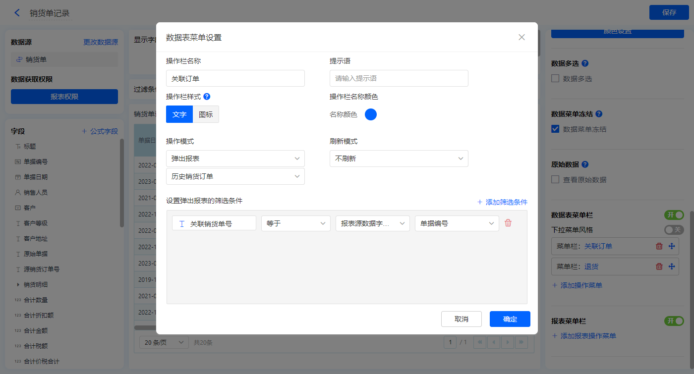 【关联销货单】的菜单栏,操作模式设置为弹出报表【历史销货单】;