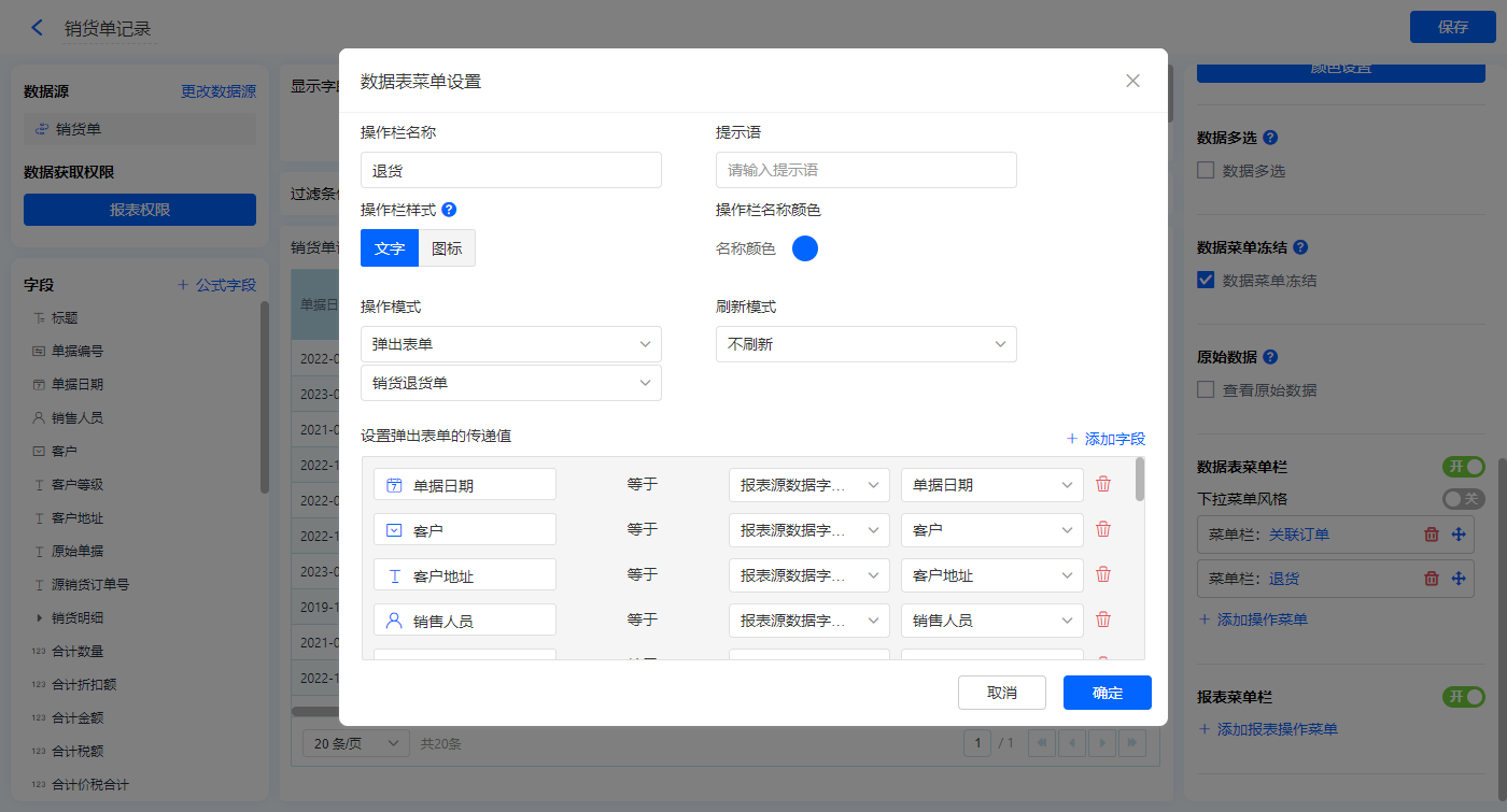 2)新增数据表菜单栏【关联订单号】、【退货】,配置如下;