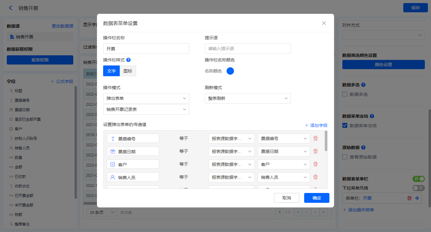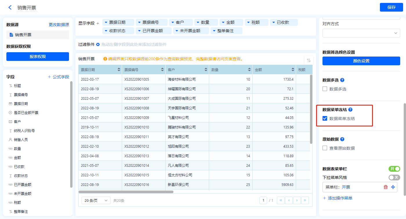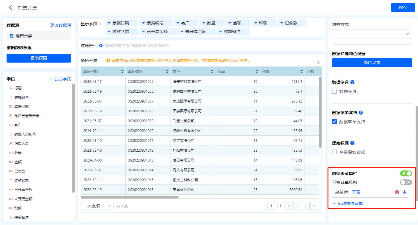 1)新增【销售开票】报表,用基础报表【数据表】展示数据源为表单【销售开票】的数据;