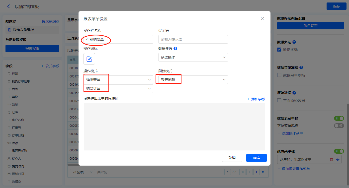 【生成购货单】的菜单栏,设置刷新模式为整表刷新,操作模式设置为弹出表单【购货订单】;