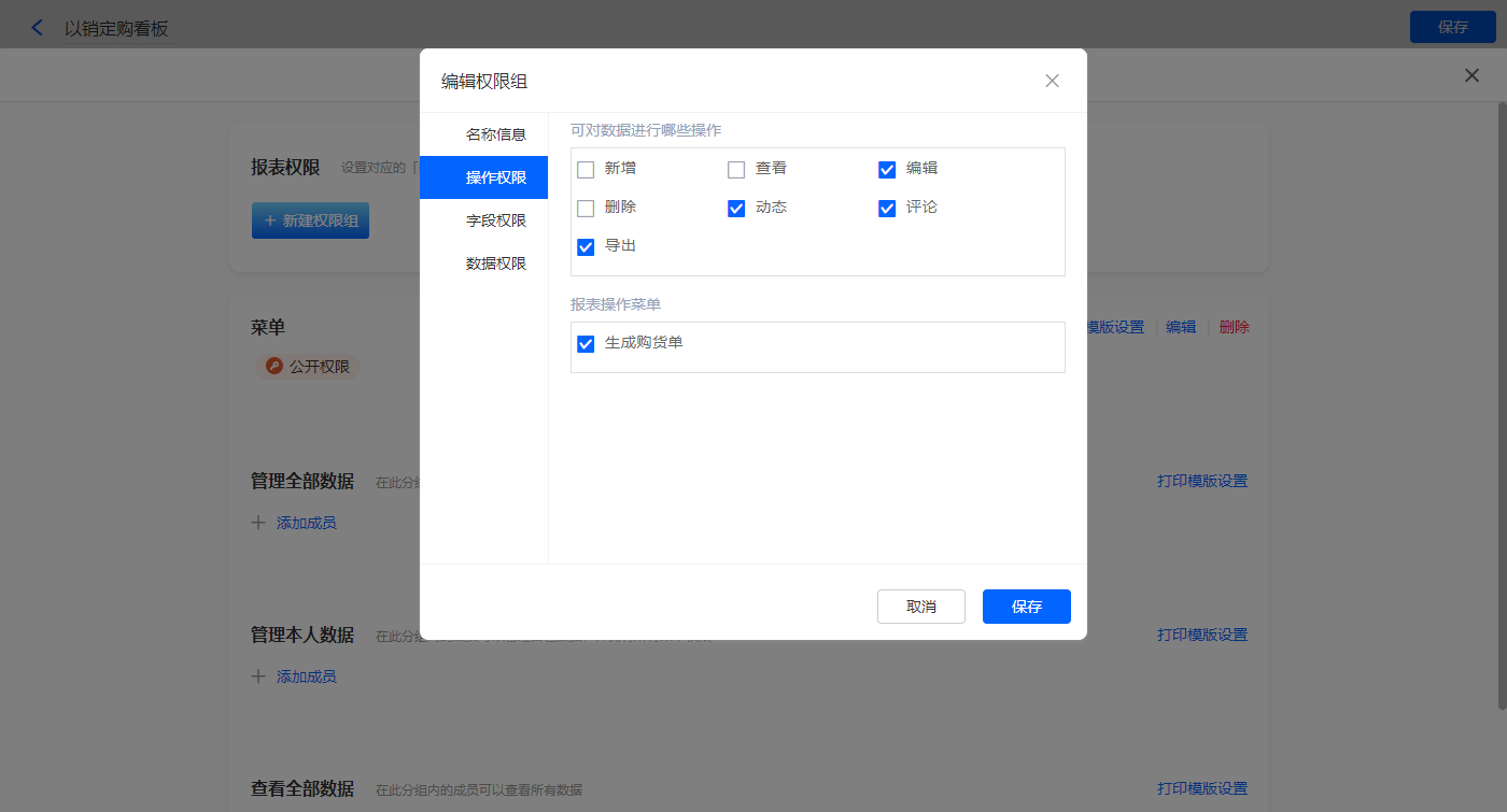 3)设置报表的权限,填入权限组名称,选择可操作的数据表菜单,点击【保存】;