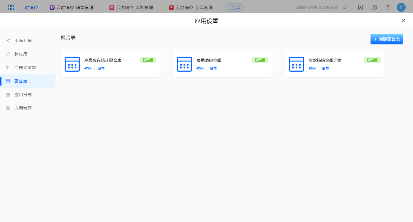 1)该应用运用到三个聚合表【产品库存统计聚合表】、【收款核销金额详情】、【费用清单金额】;