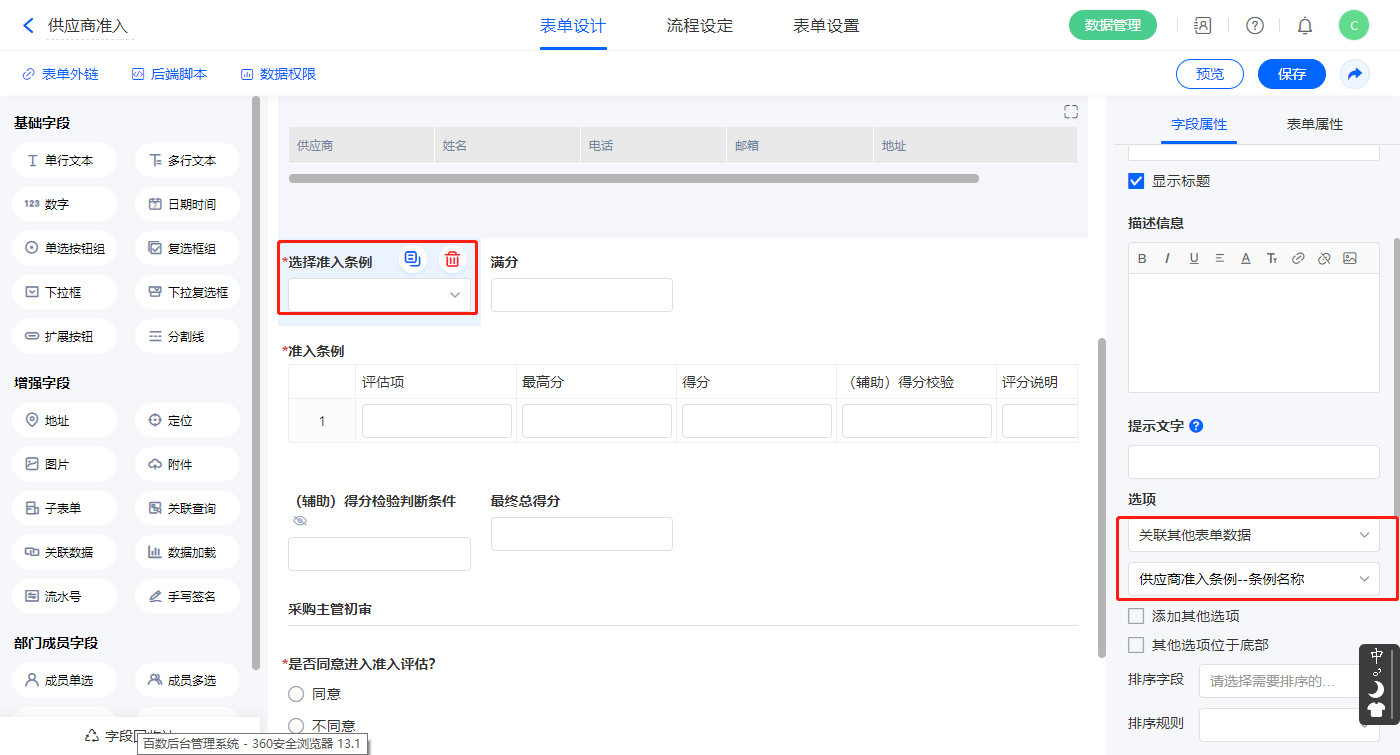 3)【选择准入条例】字段,设置选项为其他表单数据,关联供应商准入条例的【条例名称】字段;
