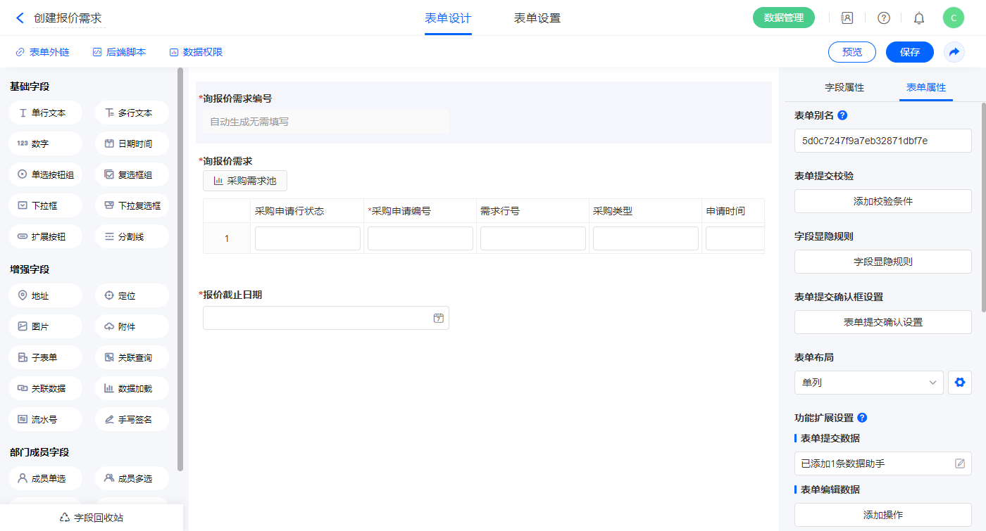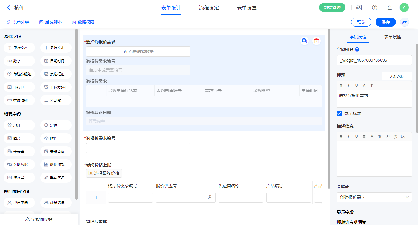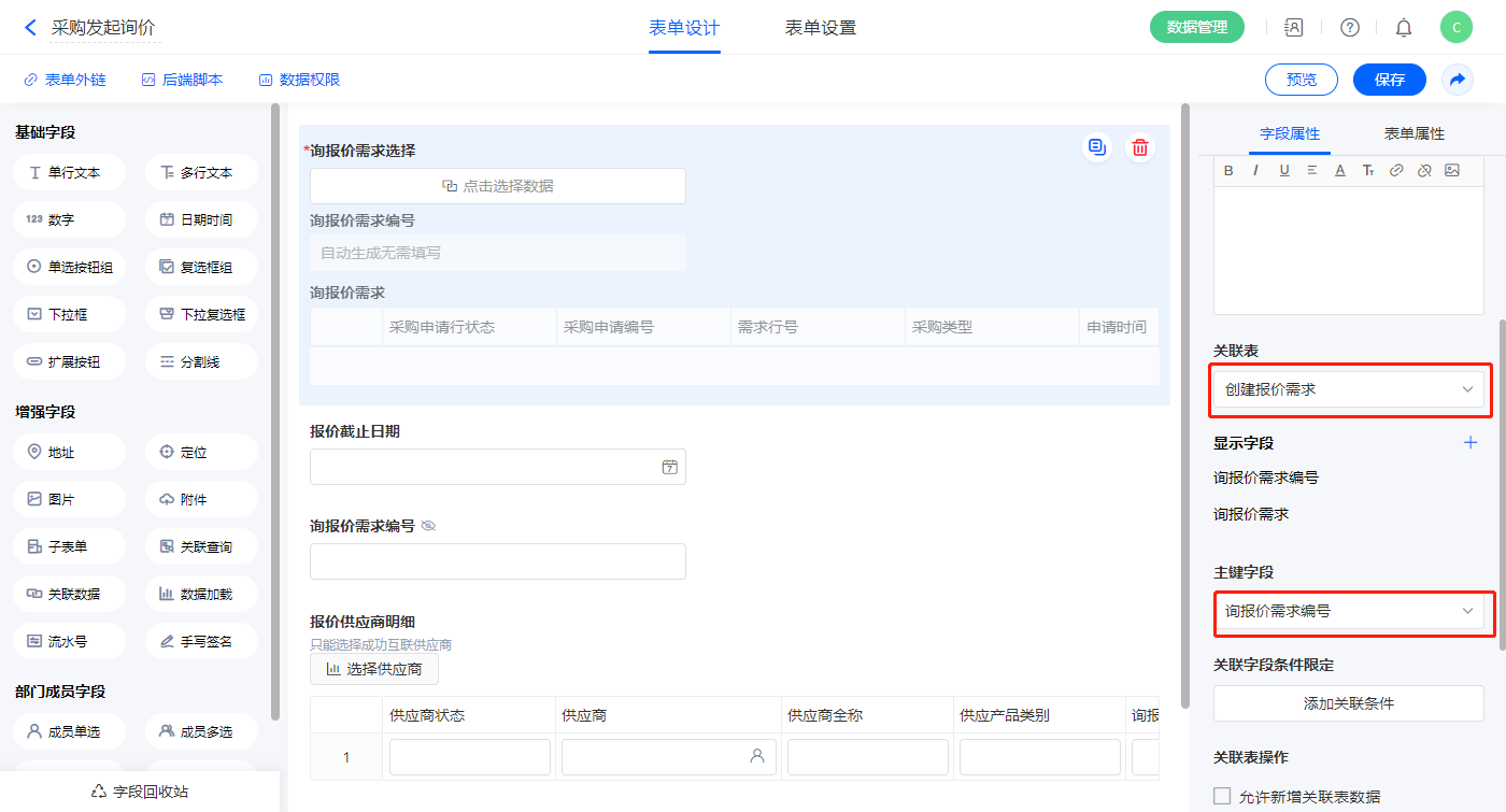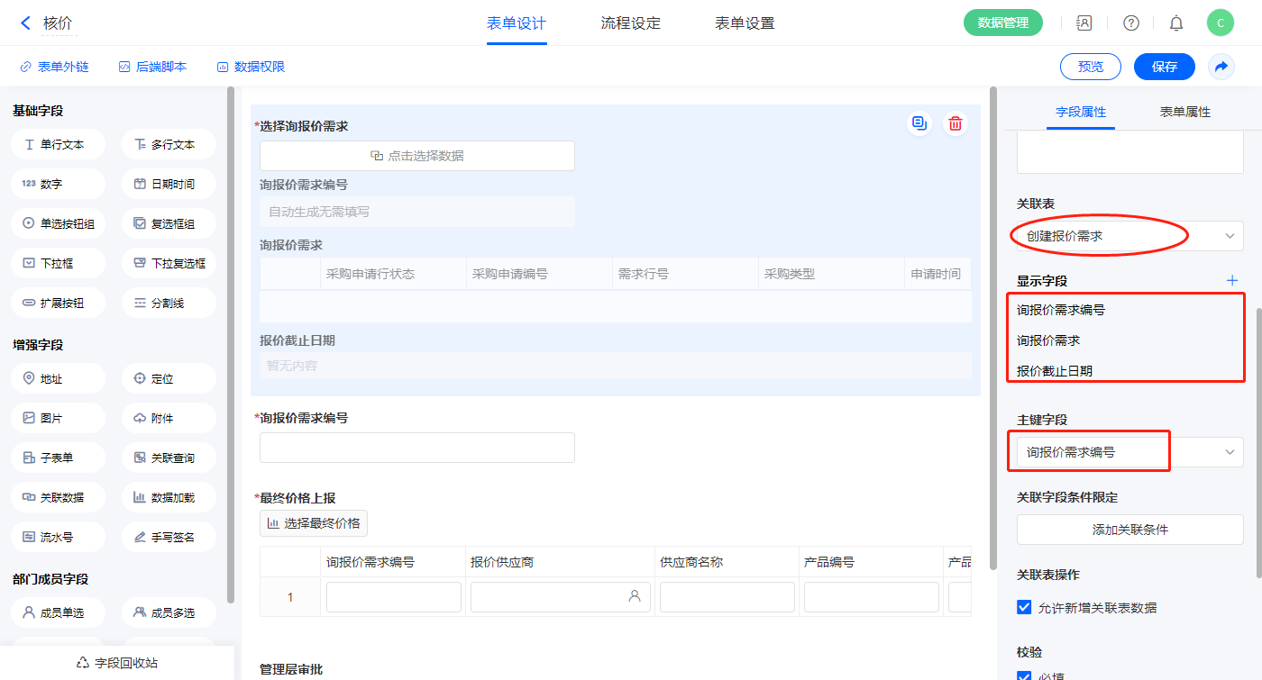 1)【询报价需求选择】关联数据字段,关联表单【创建报价需求】,如图设置显示字段,主键字段为【询报价需求编号】;