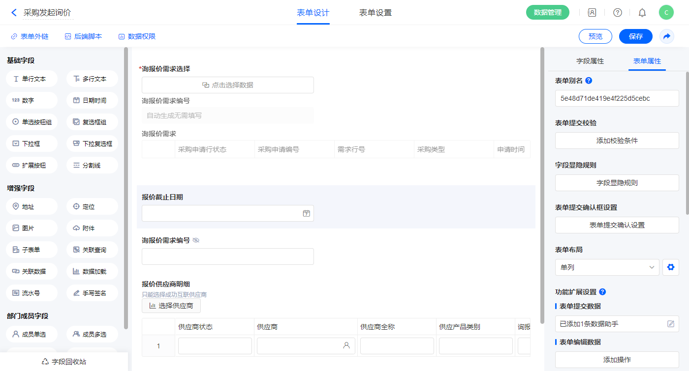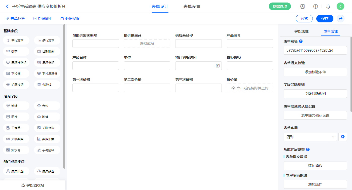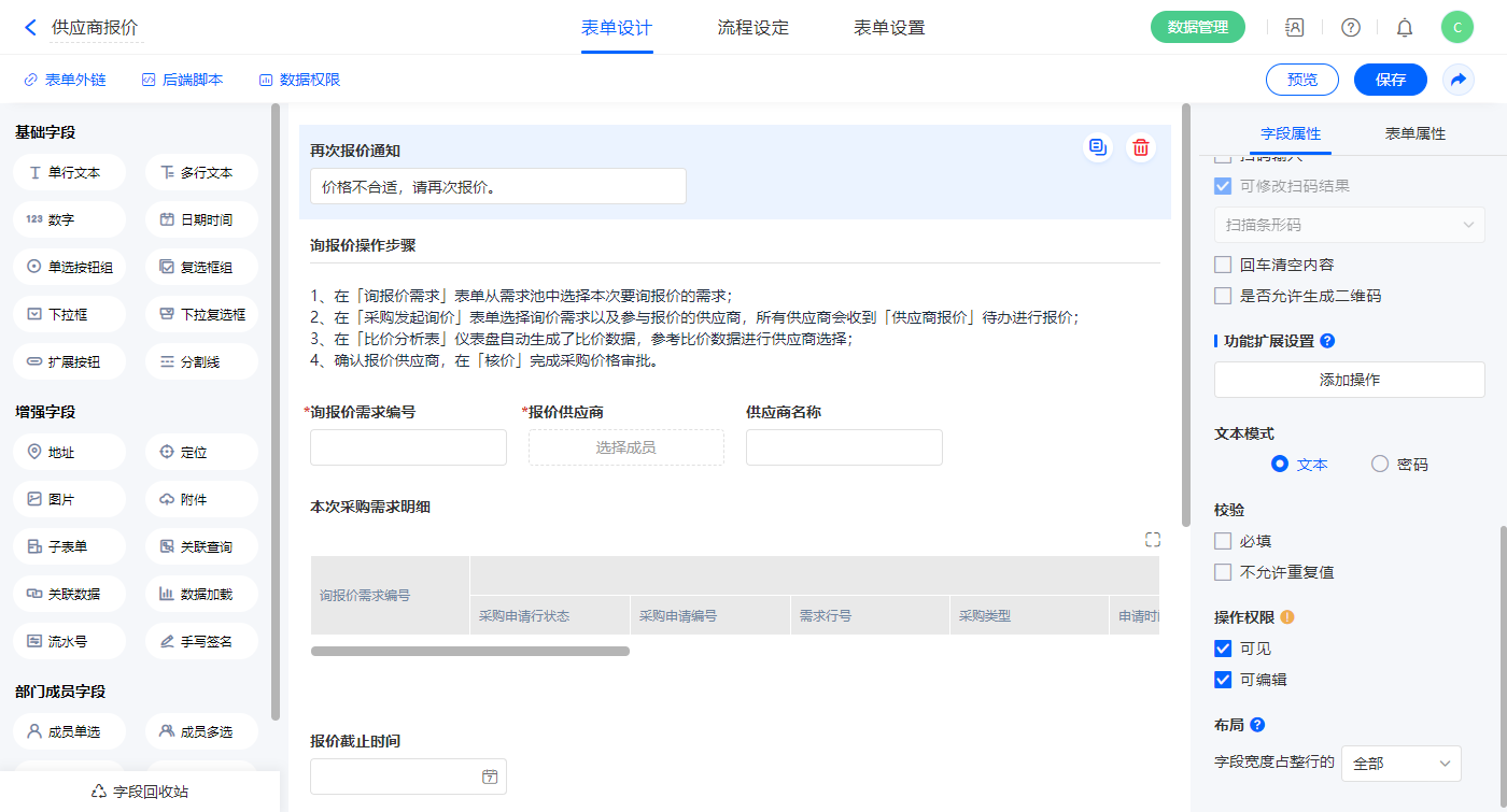 2.6、表单【供应商报价】字段及表单属性设置