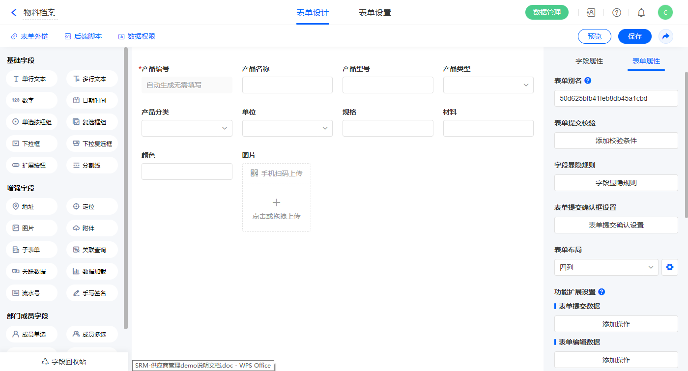 8)新增表单【物料档案】,字段设置如下;