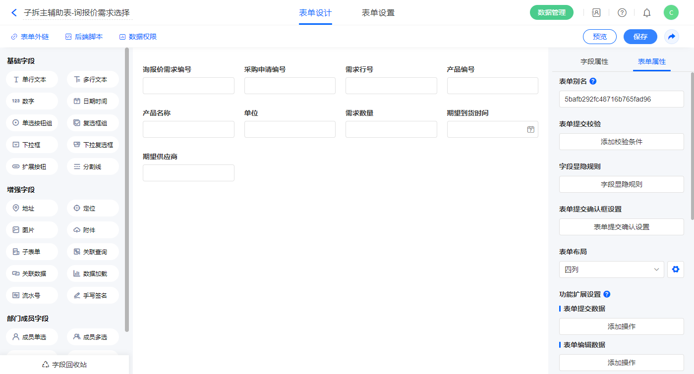 2.5、表单【采购发起询价】字段及表单属性设置