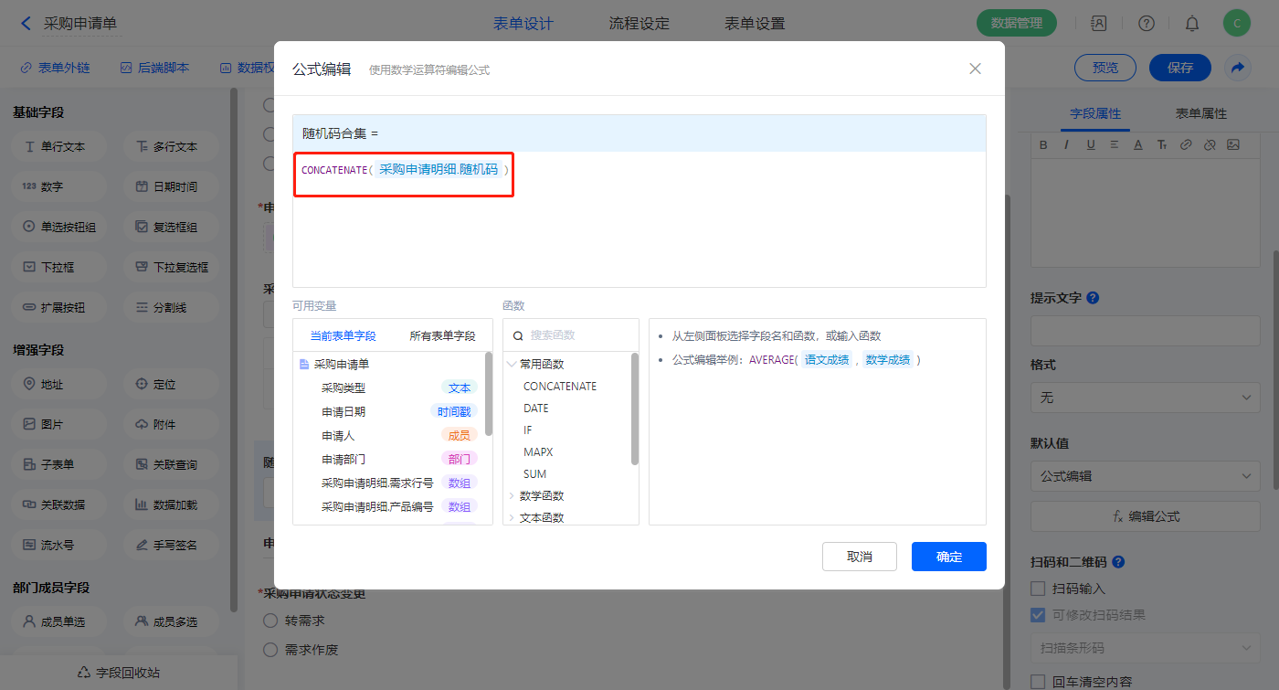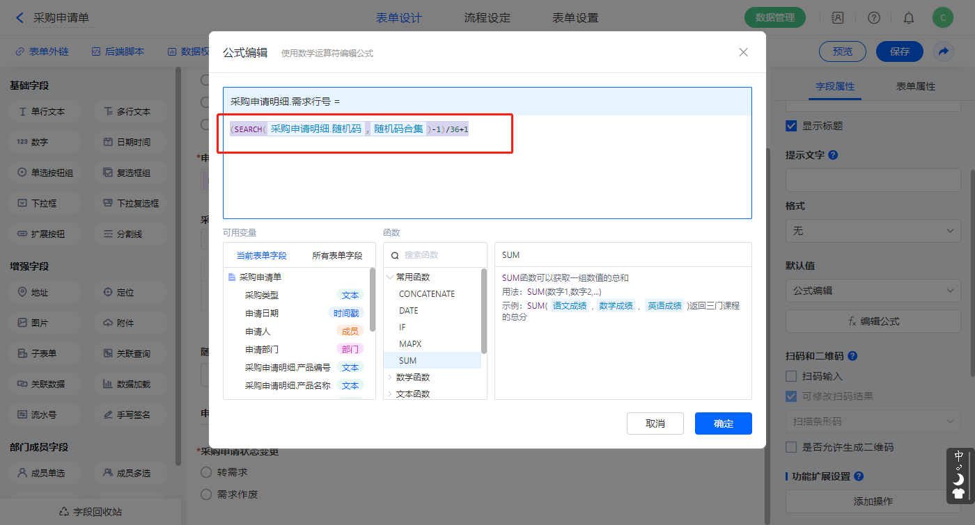 【采购申请明细.随机码】字段,设置默认值为公式编辑,如图设置公式;