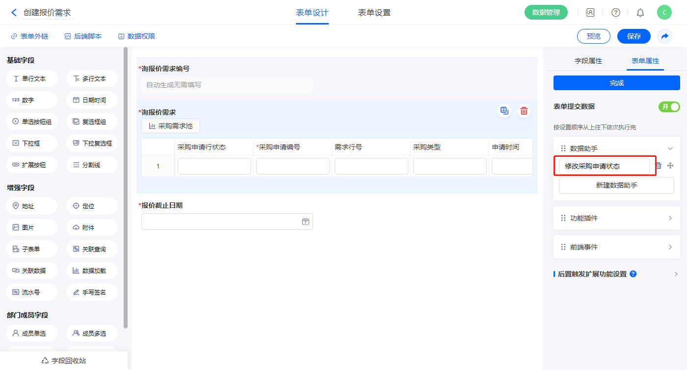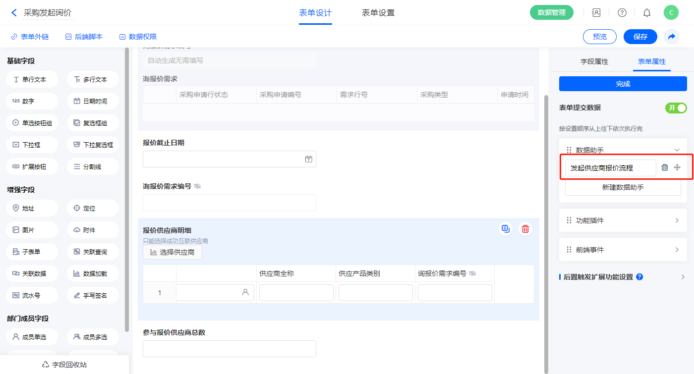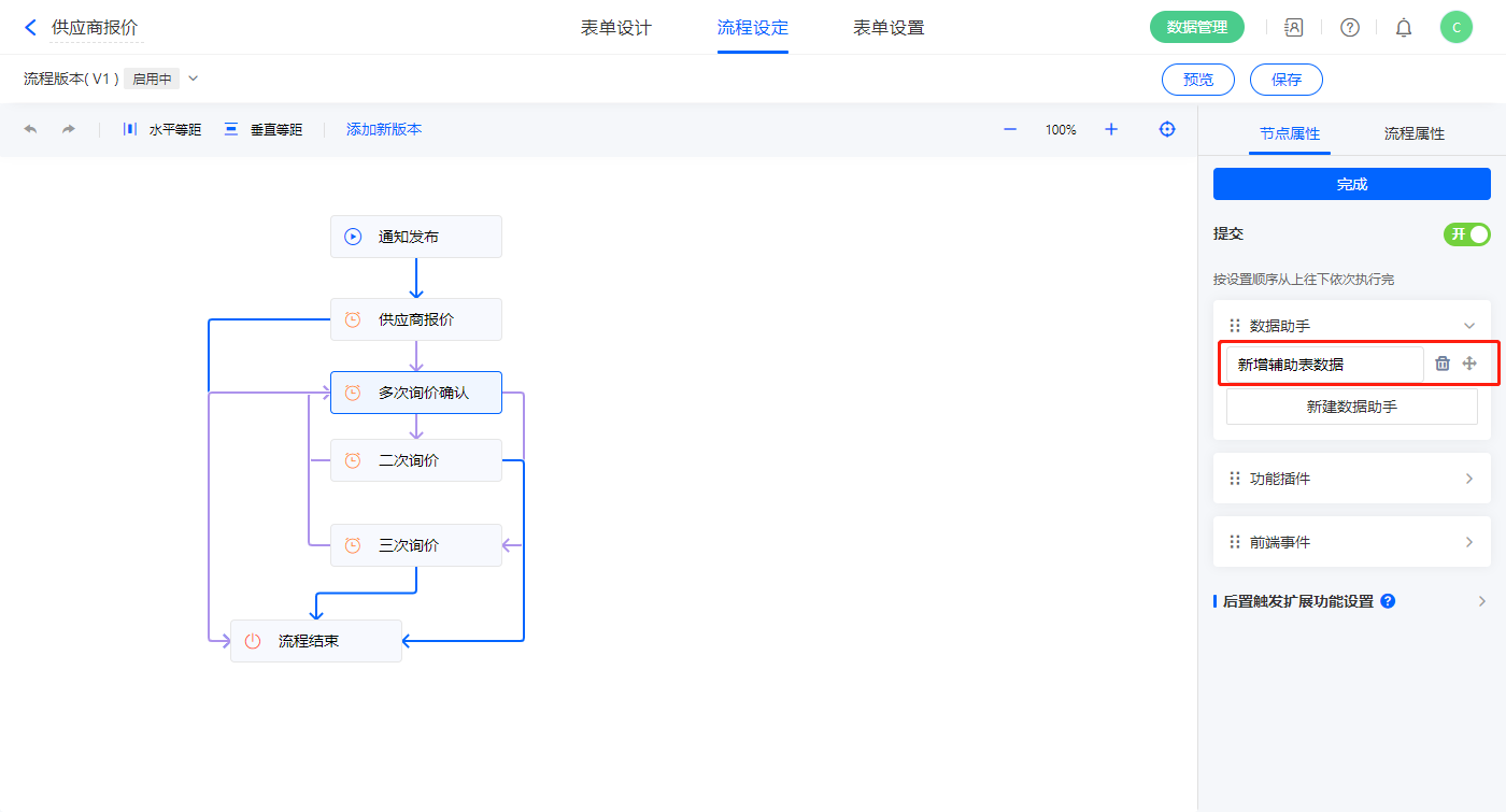4)表单提交数据新增数据助手名称为发起供应商报价流程;
