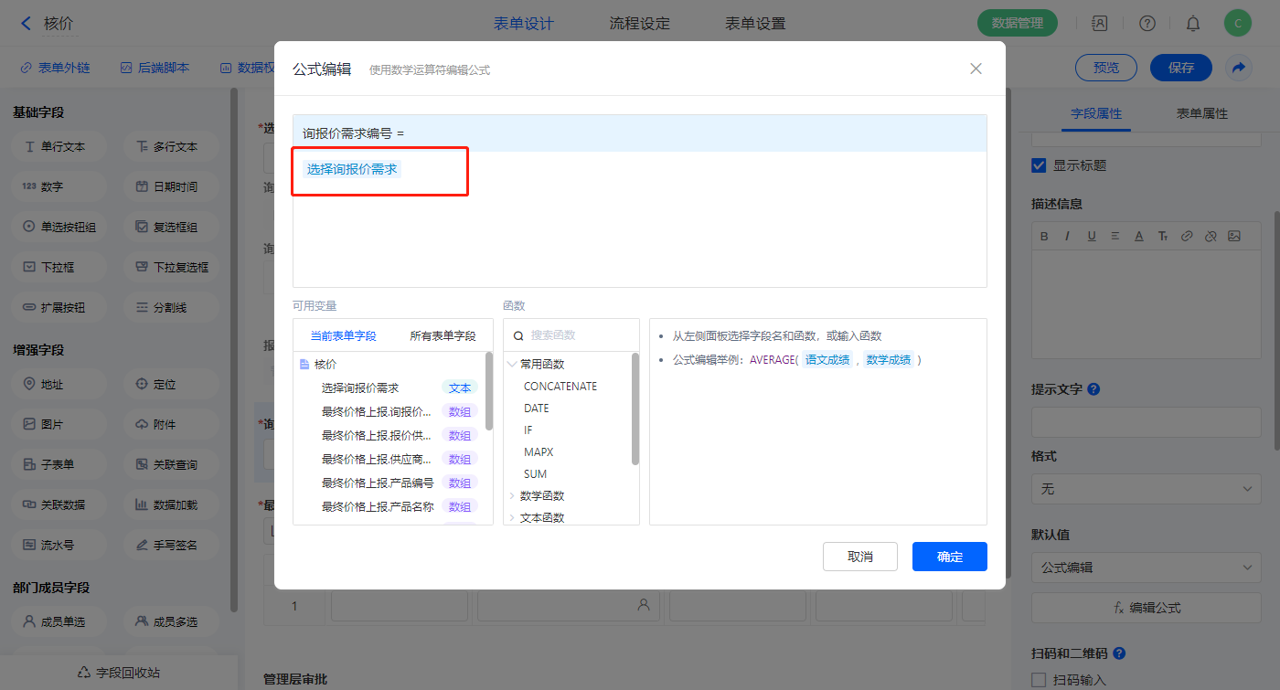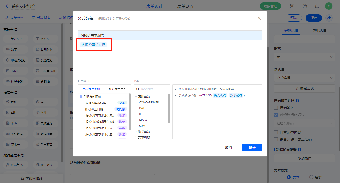 2)【询报价需求编号】字段,设置默认值为公式编辑,如图设置公式;