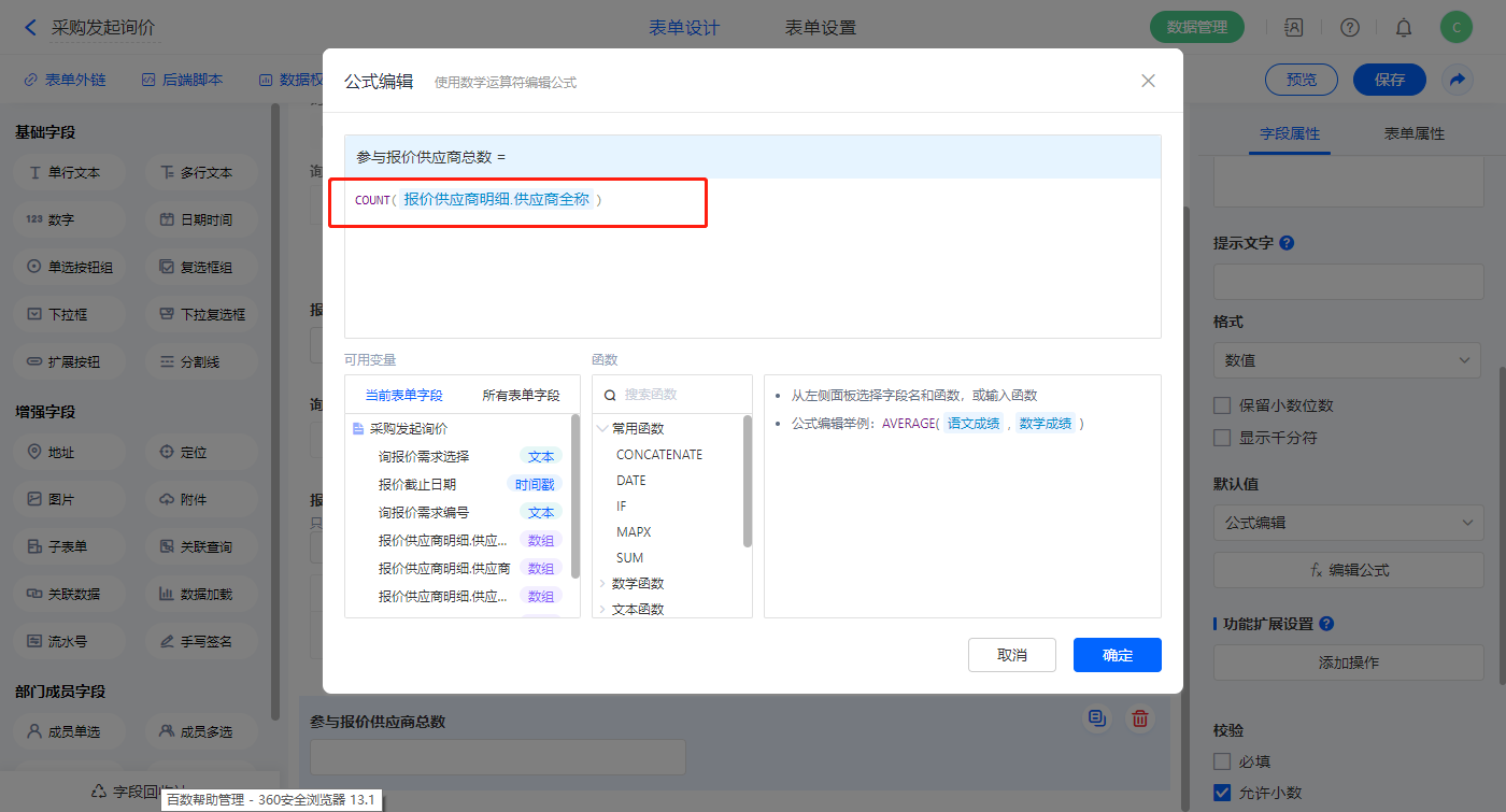 【参与报价供应商总数】字段,设置默认值为公式编辑,如图设置公式;