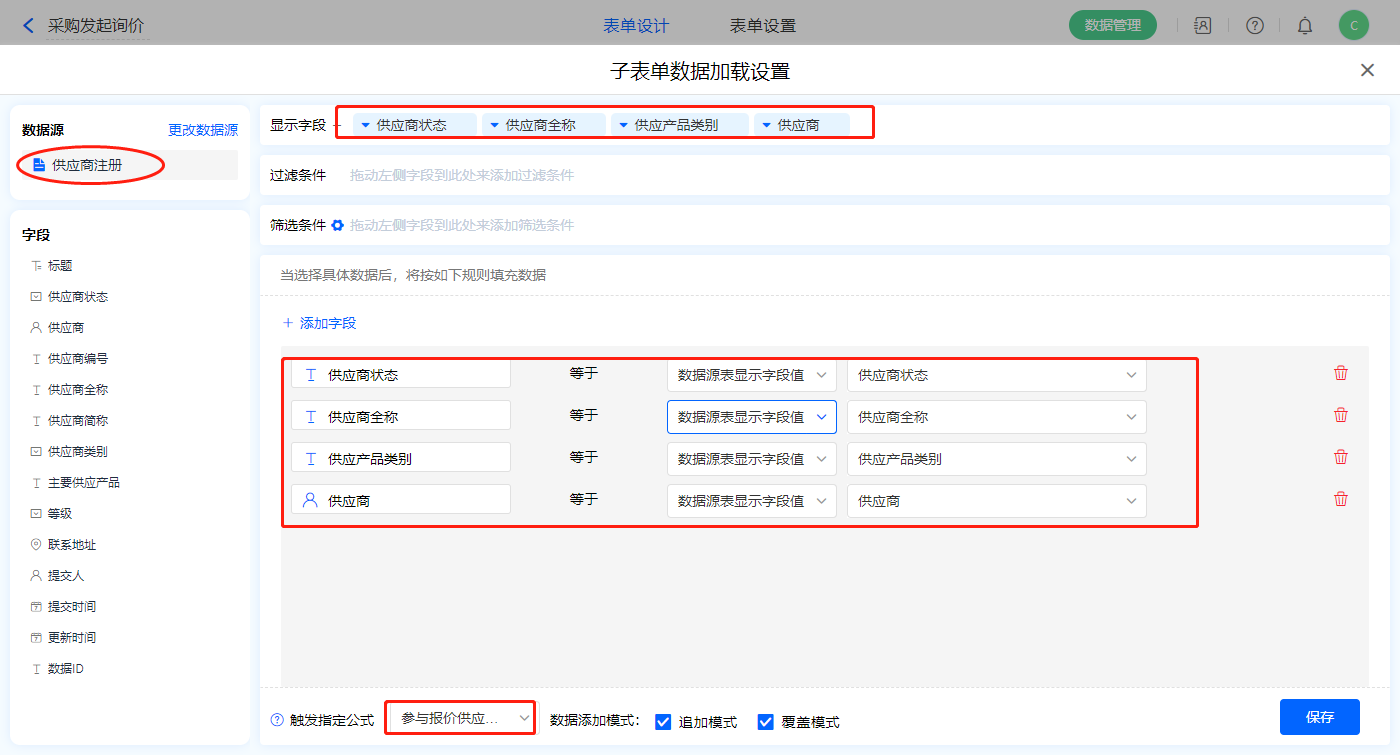 3)【报价供应商明细】子表单字段,开启数据加载,数据源为【供应商注册】,添加显示字段设置好赋值字段,触发公式为【参与报价供应商总数】字段,点击保存;