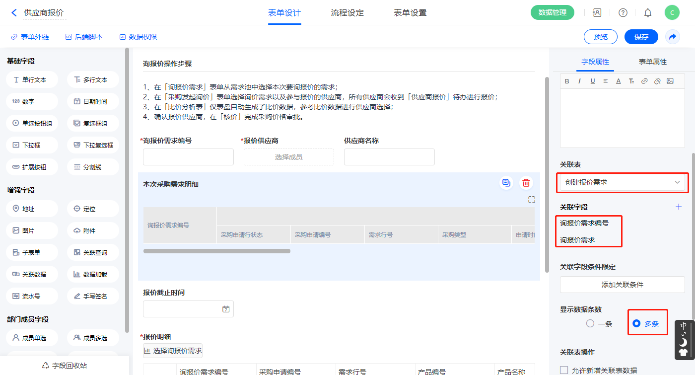3)【本次采购需求明细】关联查询字段,设置关联表为【供应商注册】并如图选择关联字段,设置显示数据条数为多条;