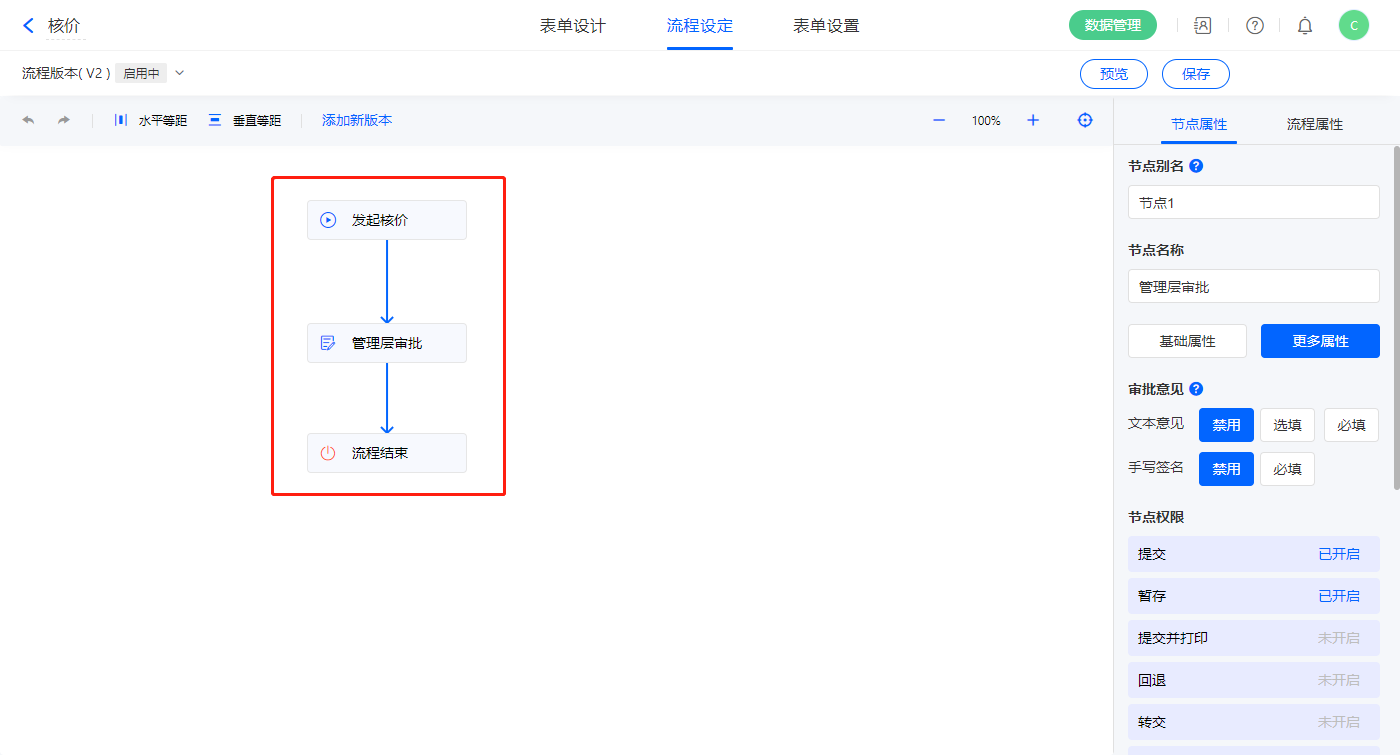 6)该表单是流程表单,设置流程节点,多次询价节点的节点权限提交设置一条数据助手;