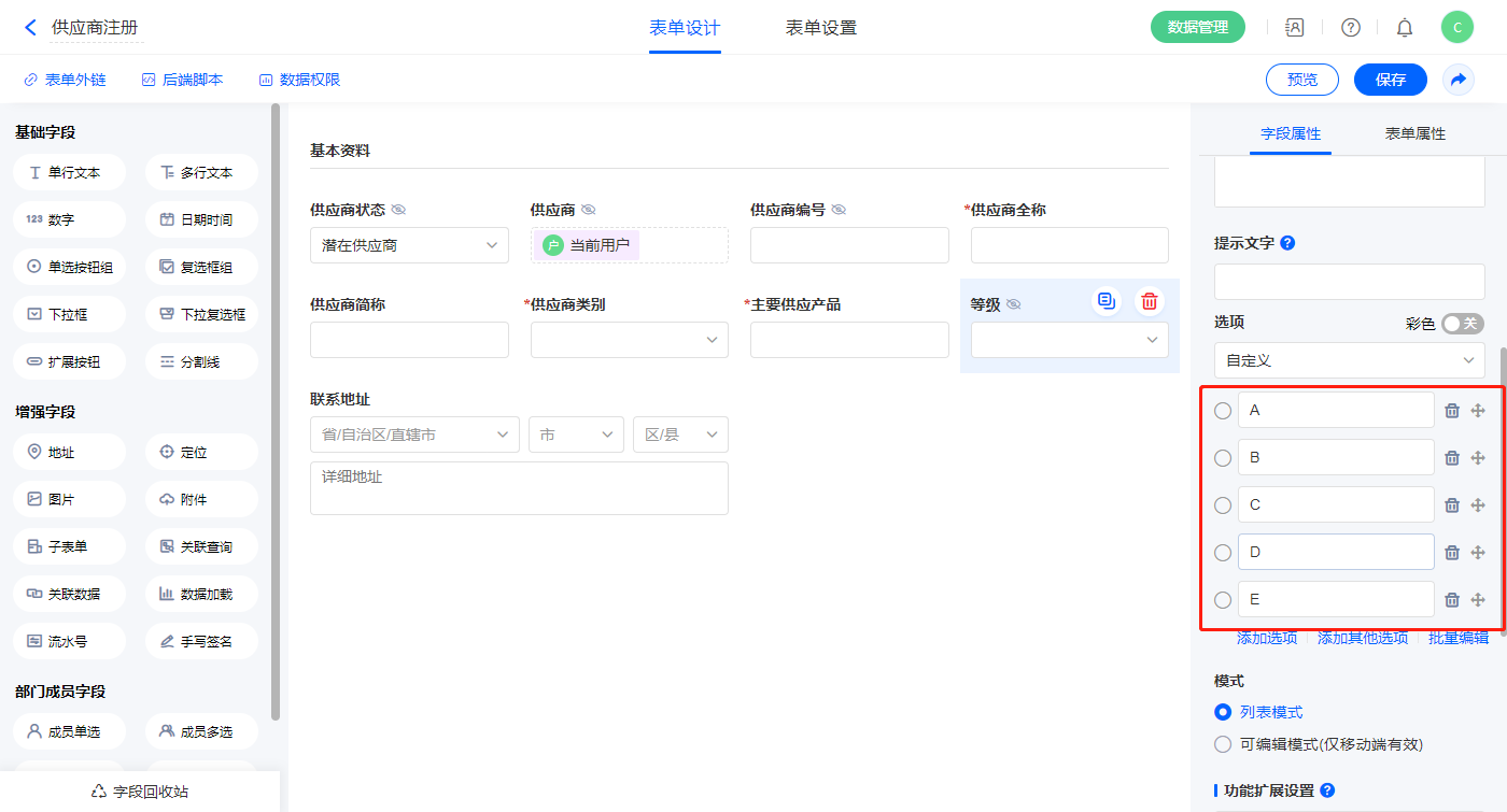 1)选中【等级】、【供应商状态】、【供应商类别】字段,输入下拉框选项;