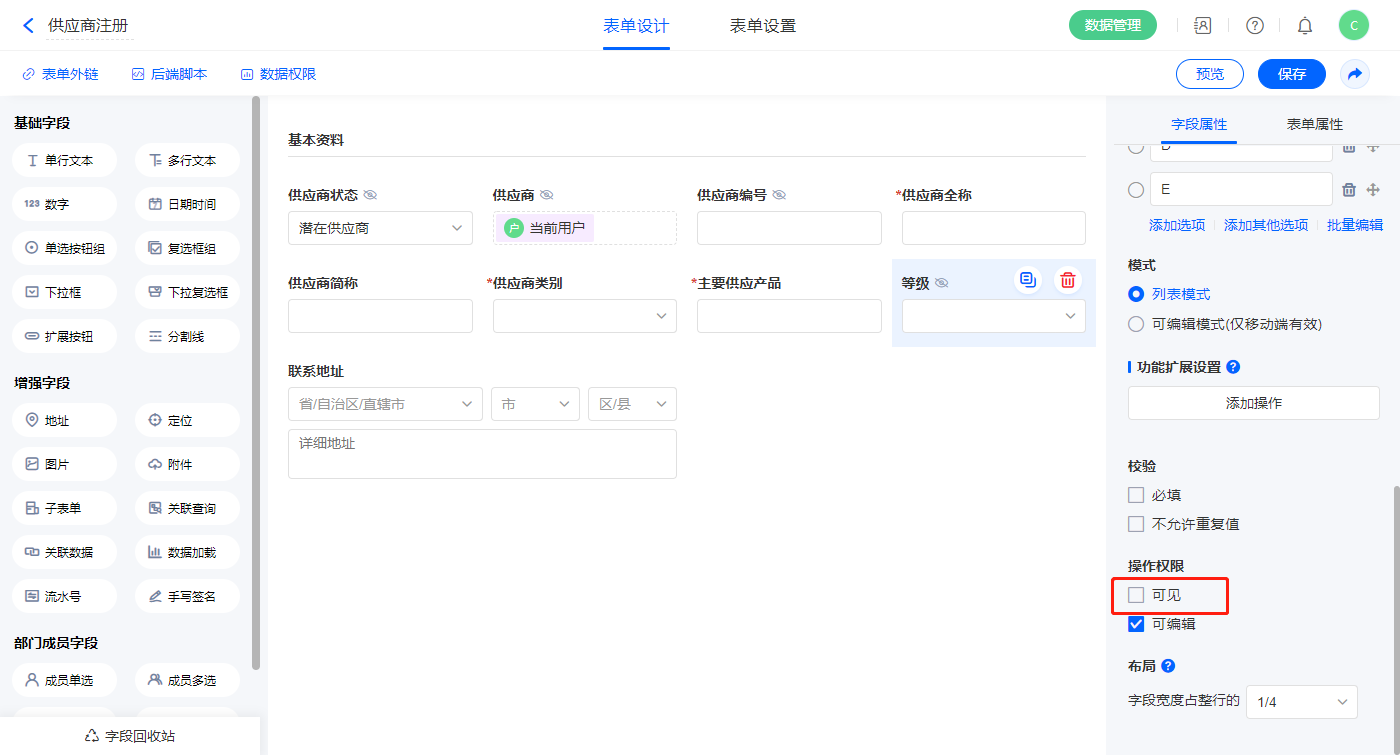 2)【等级】、【供应商状态】、【供应商编号】、【供应商】四个字段设置操作权限为不可见;