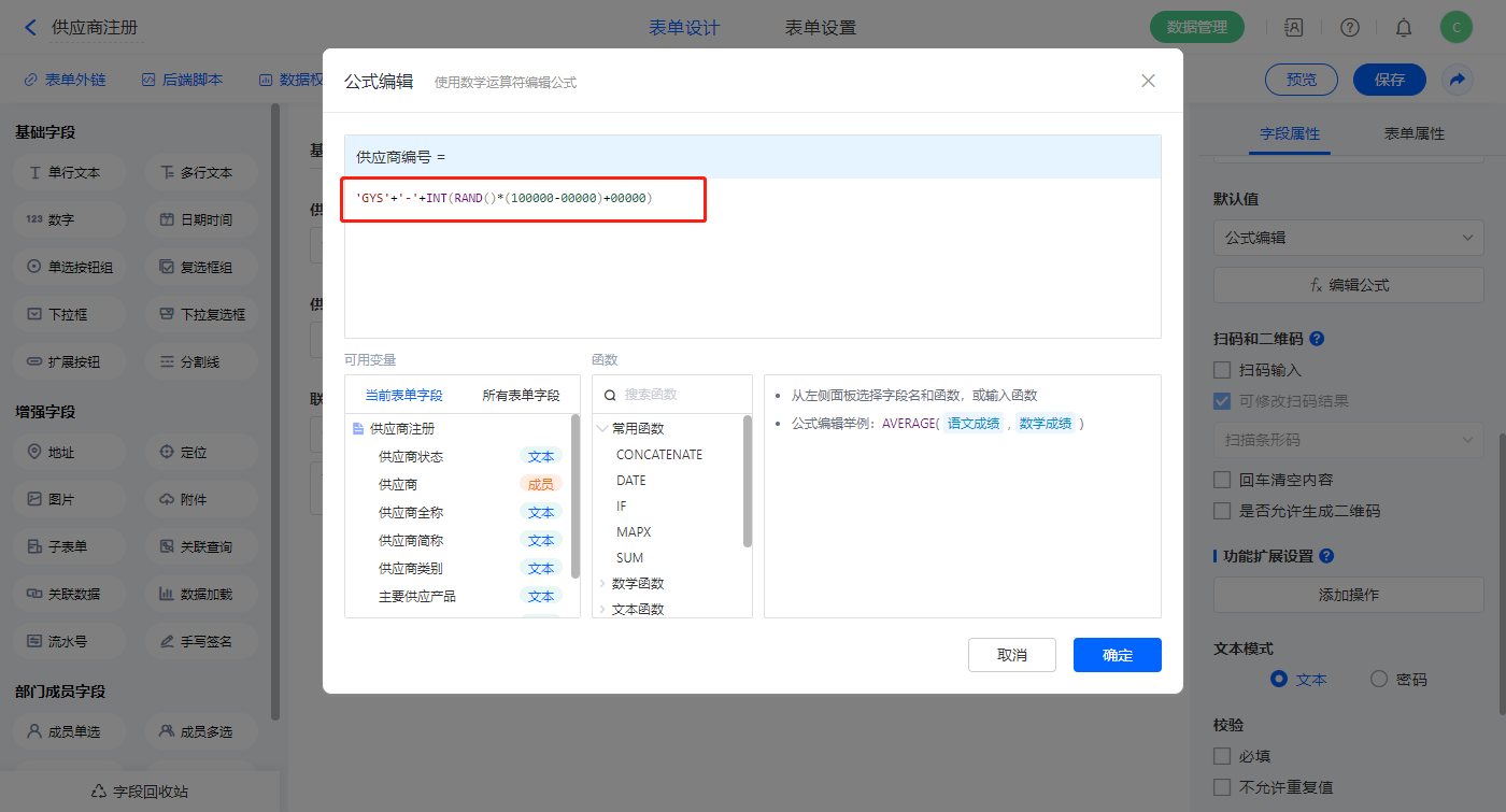 3)【供应商编号】字段设置默认值为公式编辑,设置公式:“'GYS'+'-'+INT(RAND()*(100000-00000)+00000)”;