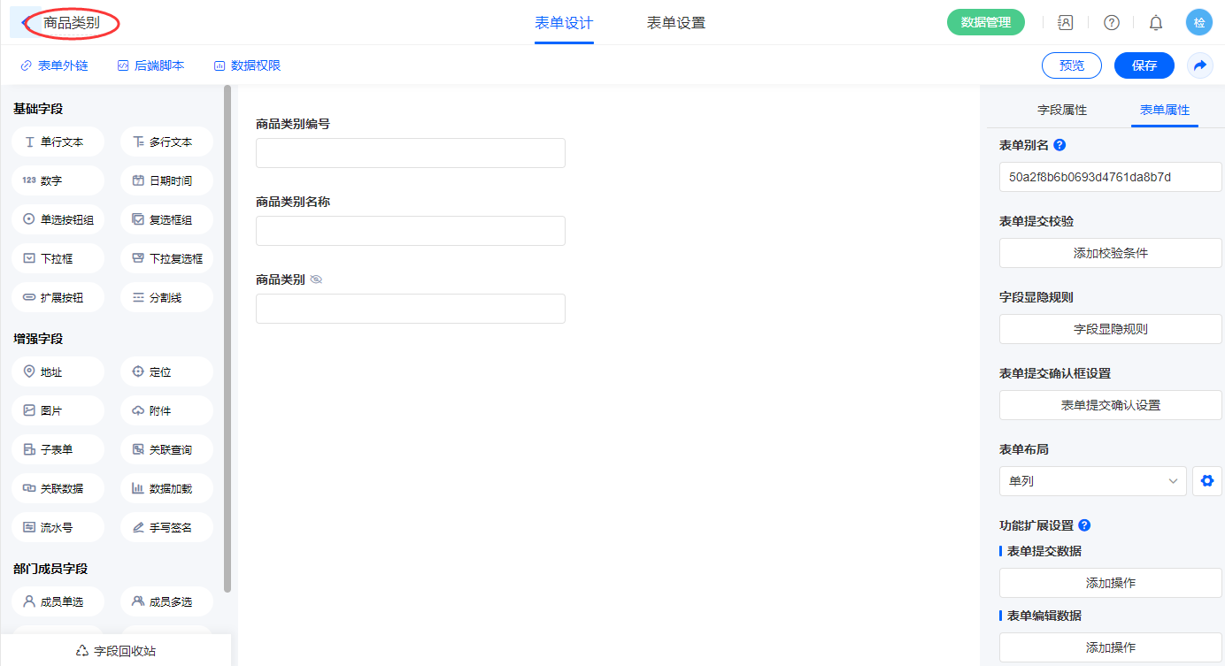 2.3、表单【商品类别】字段及表单属性设置