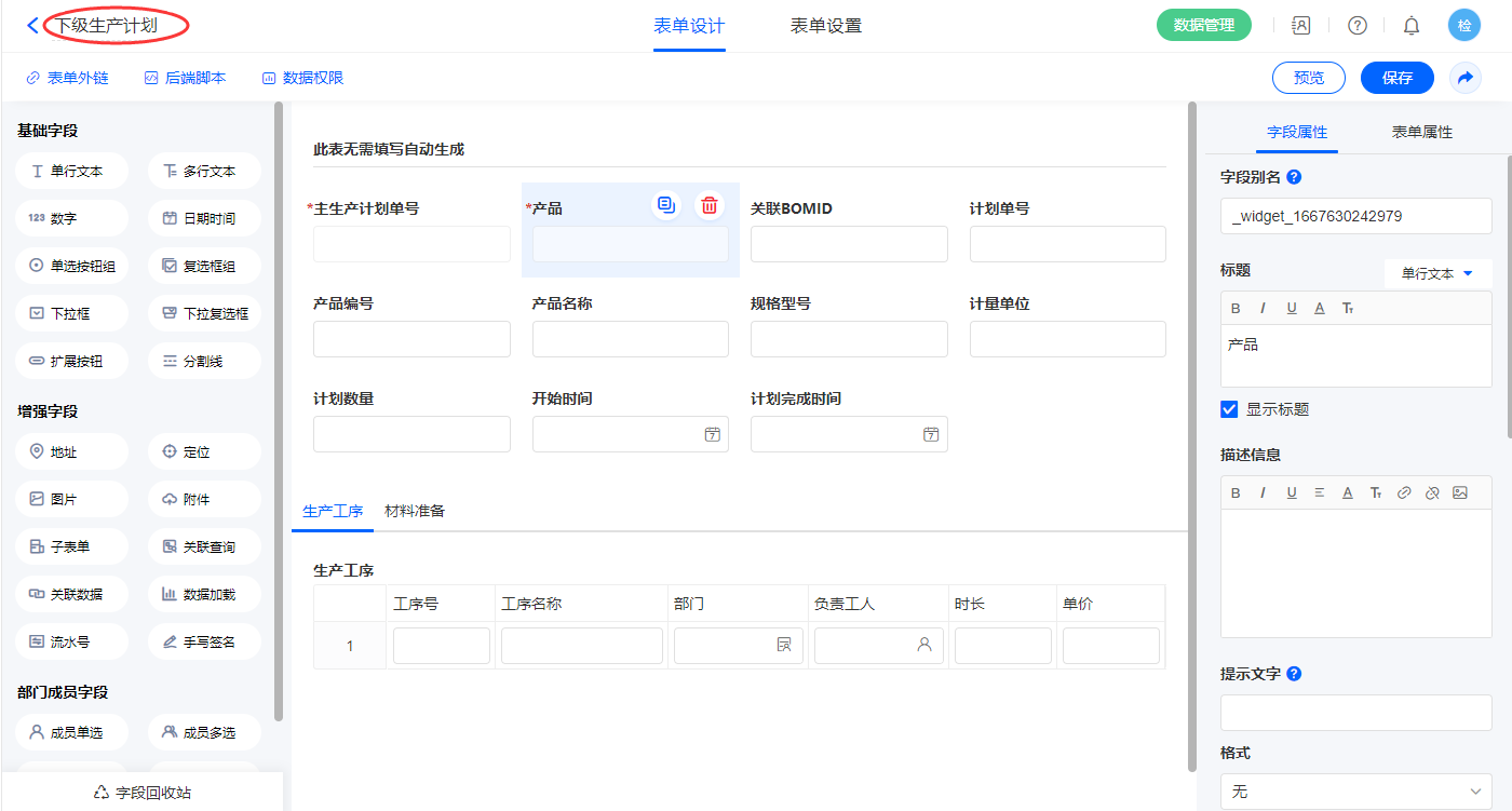 2.5、表单【生产计划】字段及表单属性设置
