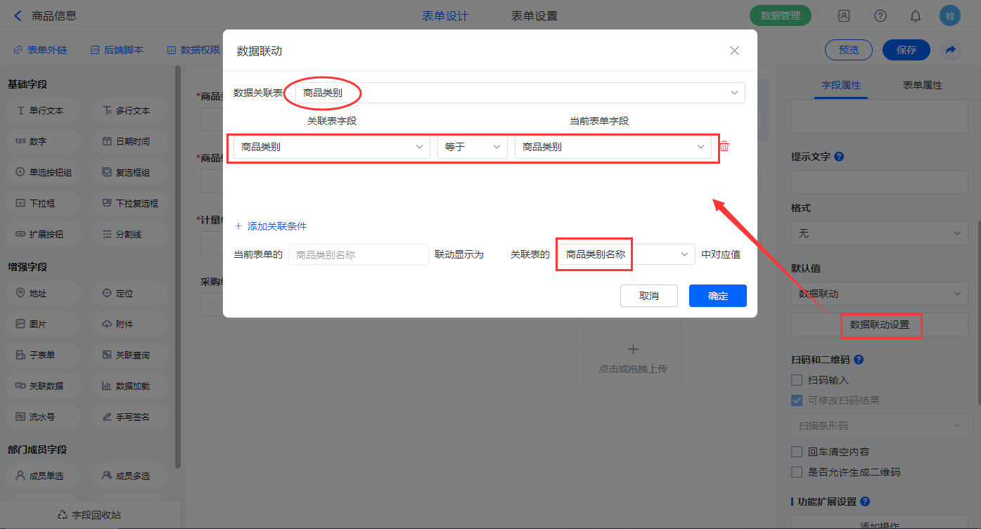 1)【商品类别】字段,选择设置为关联其他表单数据,关联商品类别的【商品类别】字段;