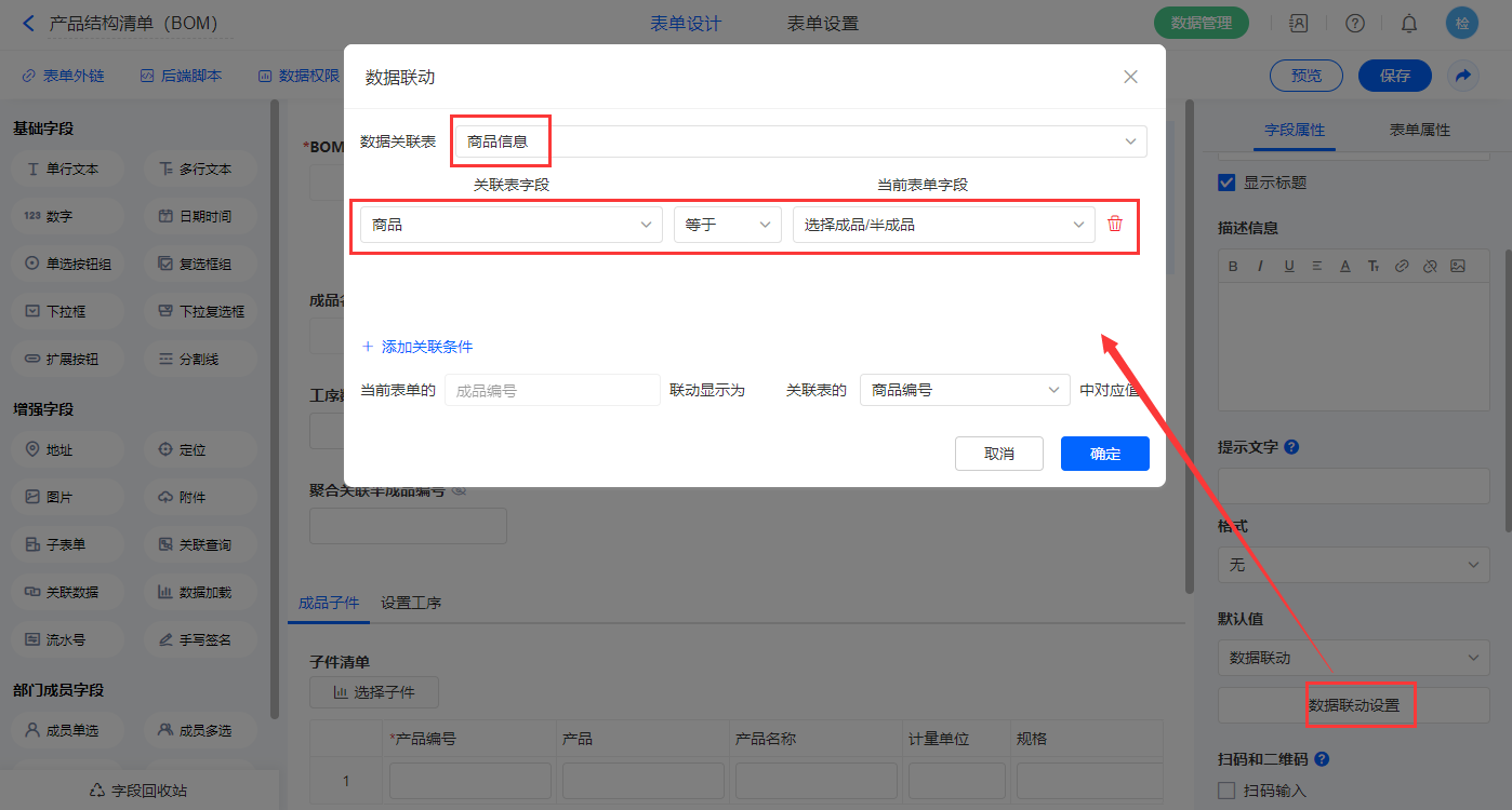 1)【选择成品/半成品】、【成品编号】、【成品名称】、【规格】、【计量单位】、【来源】字段,设置默认值为数据联动,以上字段关联表及关联条件相同,设置对应的联动字段即可;