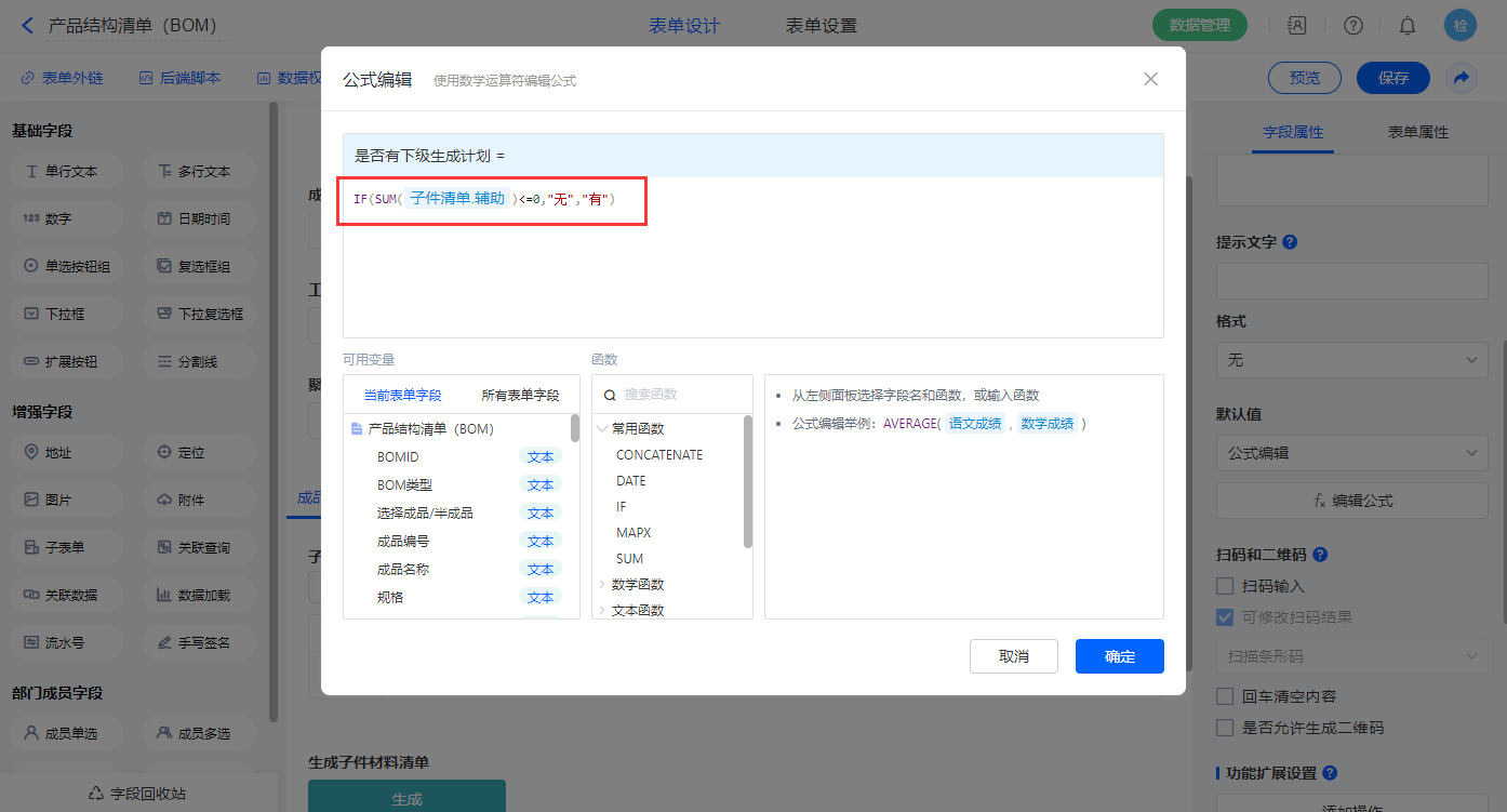 【是否有下级生产计划】字段,设置默认值为公式编辑,如图设置公式;
