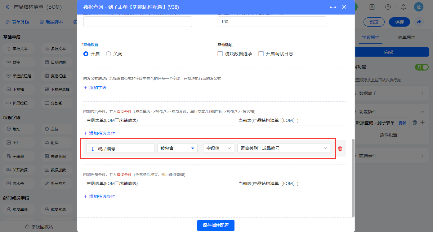 其他设置触发条件为【BOM类型】字段等于半成品,设置好点击【完成】并保存该数据助手;