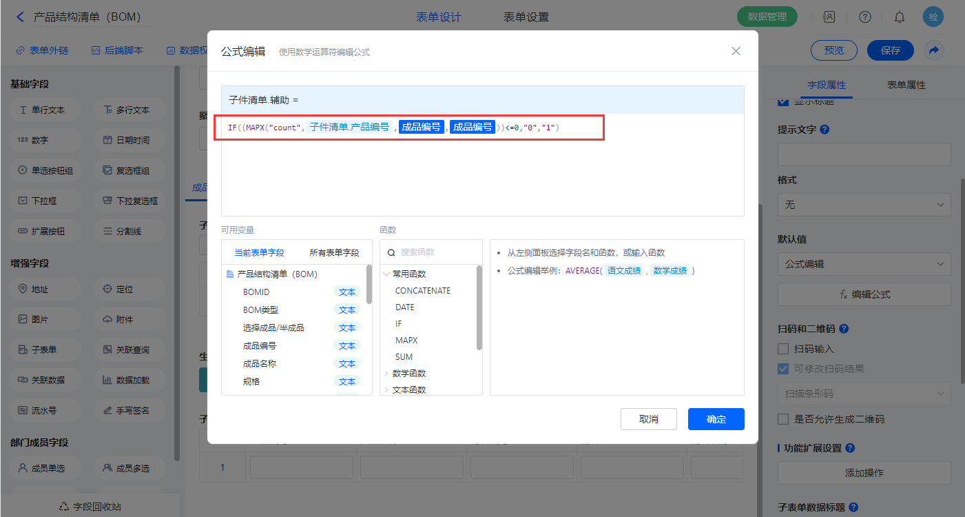 5)【子件清单.辅助】字段,设置默认值为公式编辑,如图设置公式;