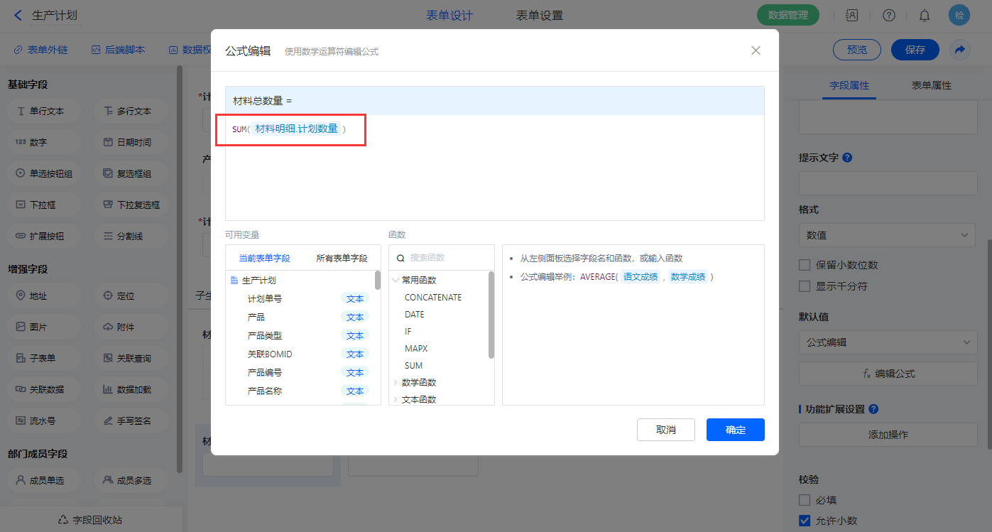 【材料总数量】字段,设置默认值为公式编辑,如图设置公式;