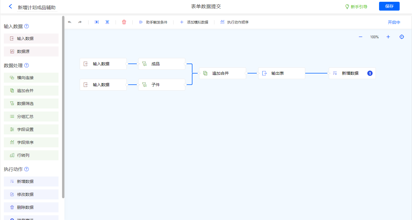 名称为新增计划成品辅助的数据助手,新增新增数据执行动作,通过数据处理得到输出表;