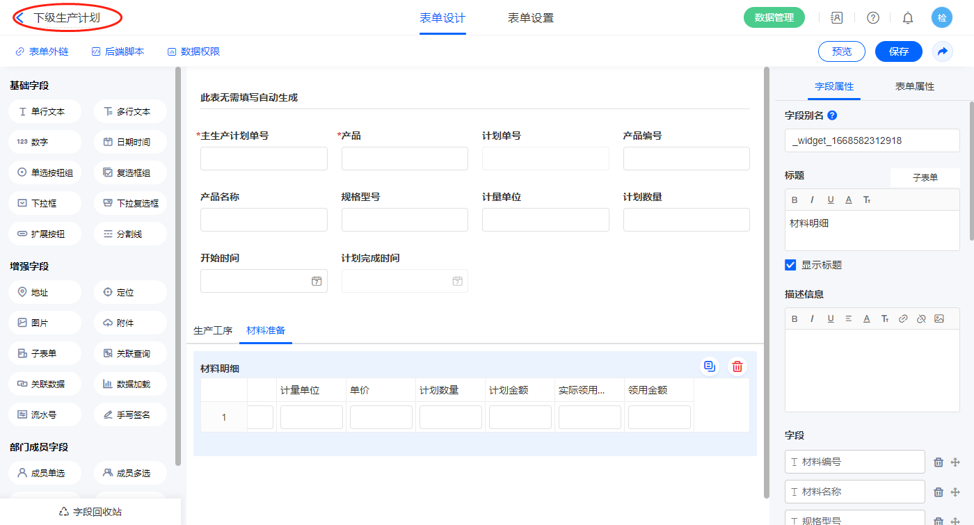 | 计划数量 | 数字 | 材料明细 | 子表单 |