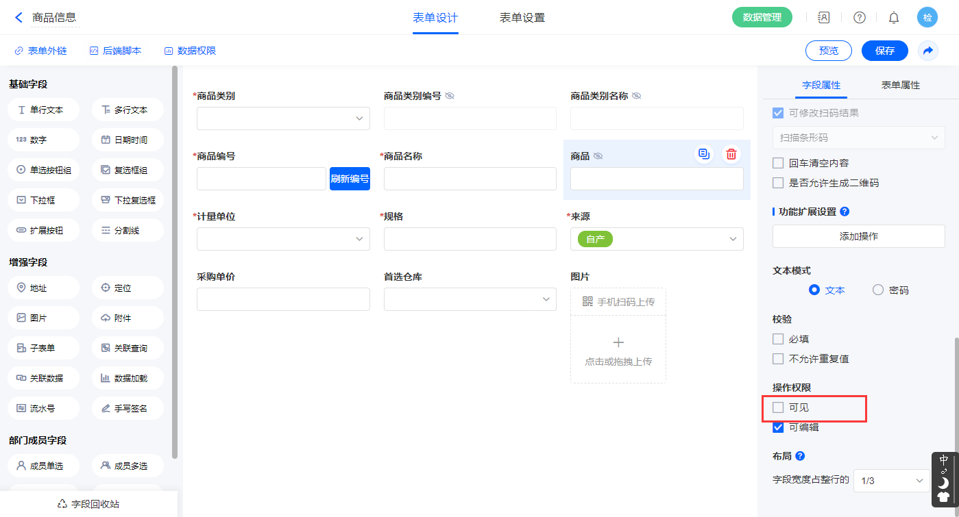 5)【商品类别编号】、【商品类别名称】、【商品】三个字段设置操作权限为不可见;