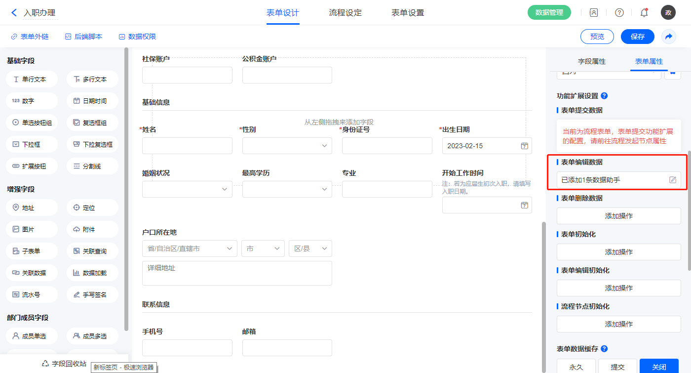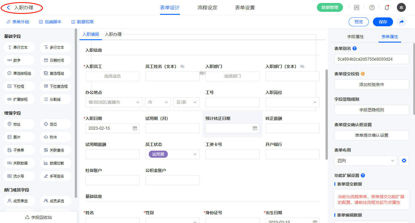 2.3、表单【入职办理】字段及表单属性设置