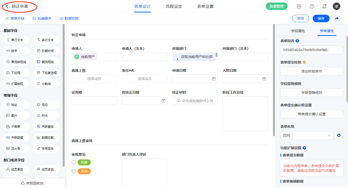 2.4、表单【转正申请】字段及表单属性设置