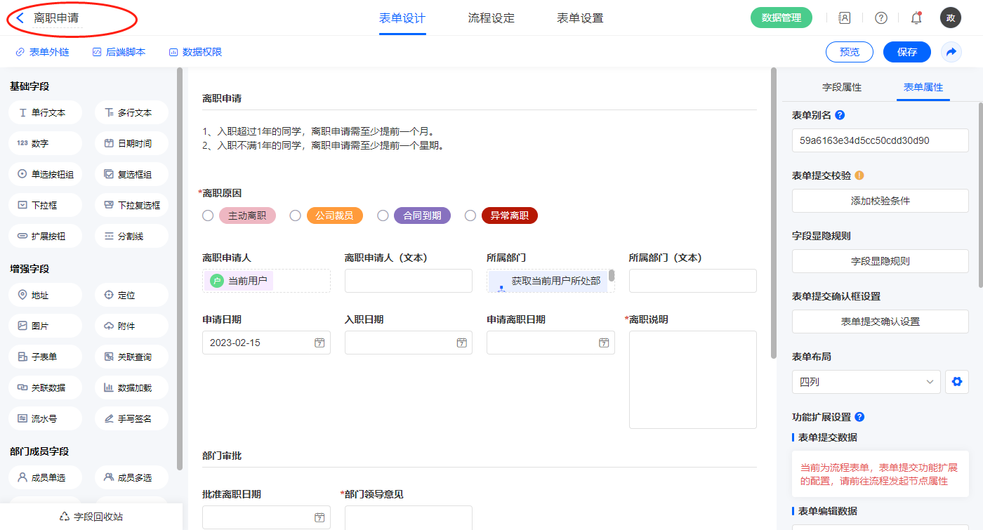 2.5、表单【离职申请】字段及表单属性设置