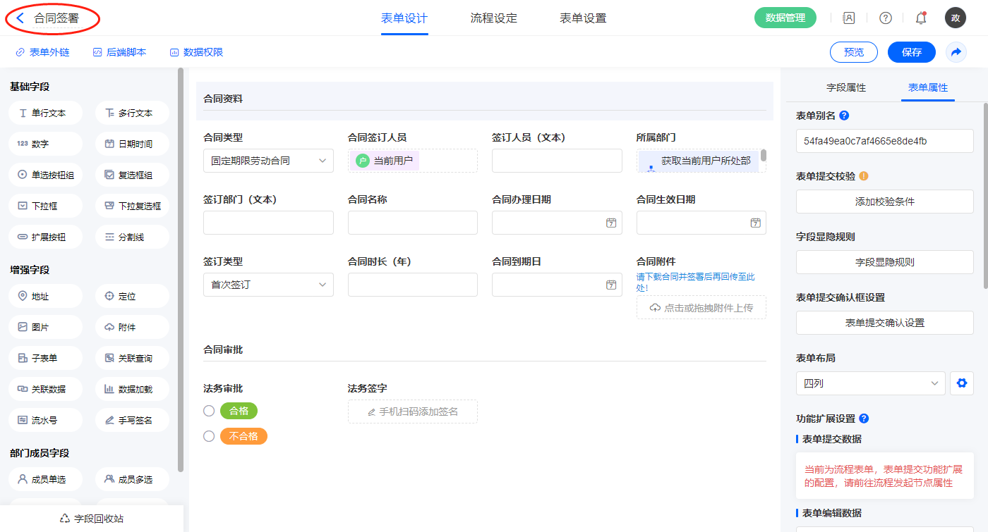 2.6、表单【合同签署】字段及表单属性设置