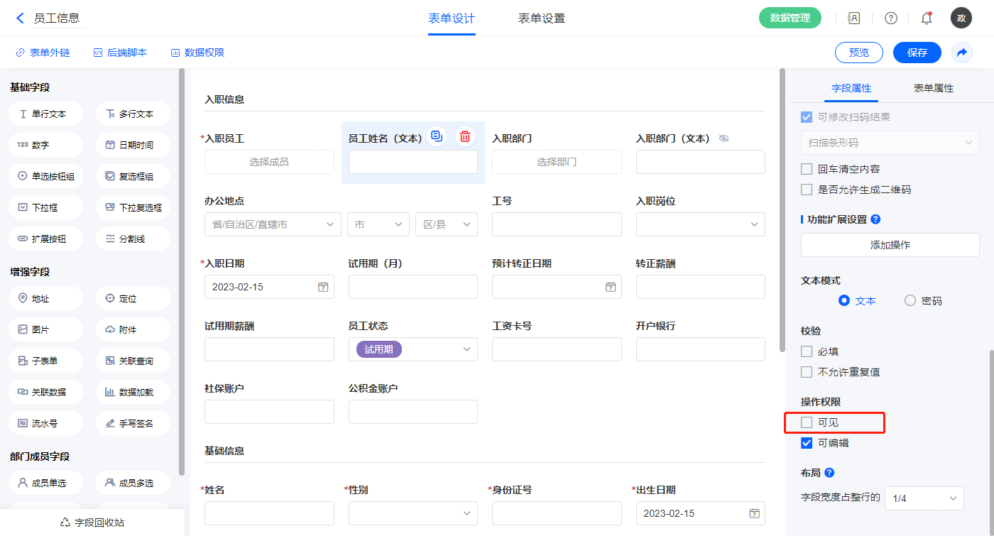1)【员工姓名(文本)】、【入职部门(文本)】字段,设置不可见;
