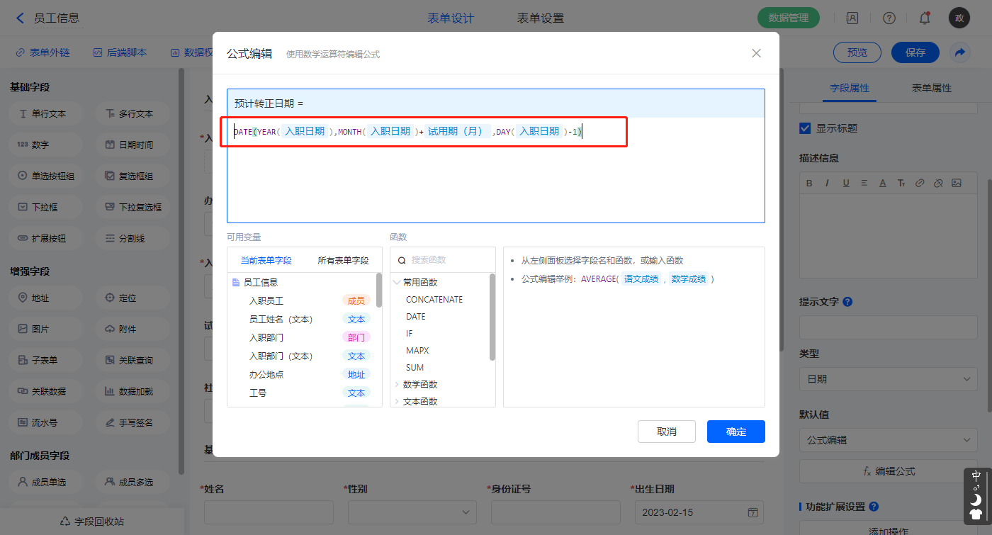 【预计转正日期】字段,默认值选择公式编辑,如图设置公式;