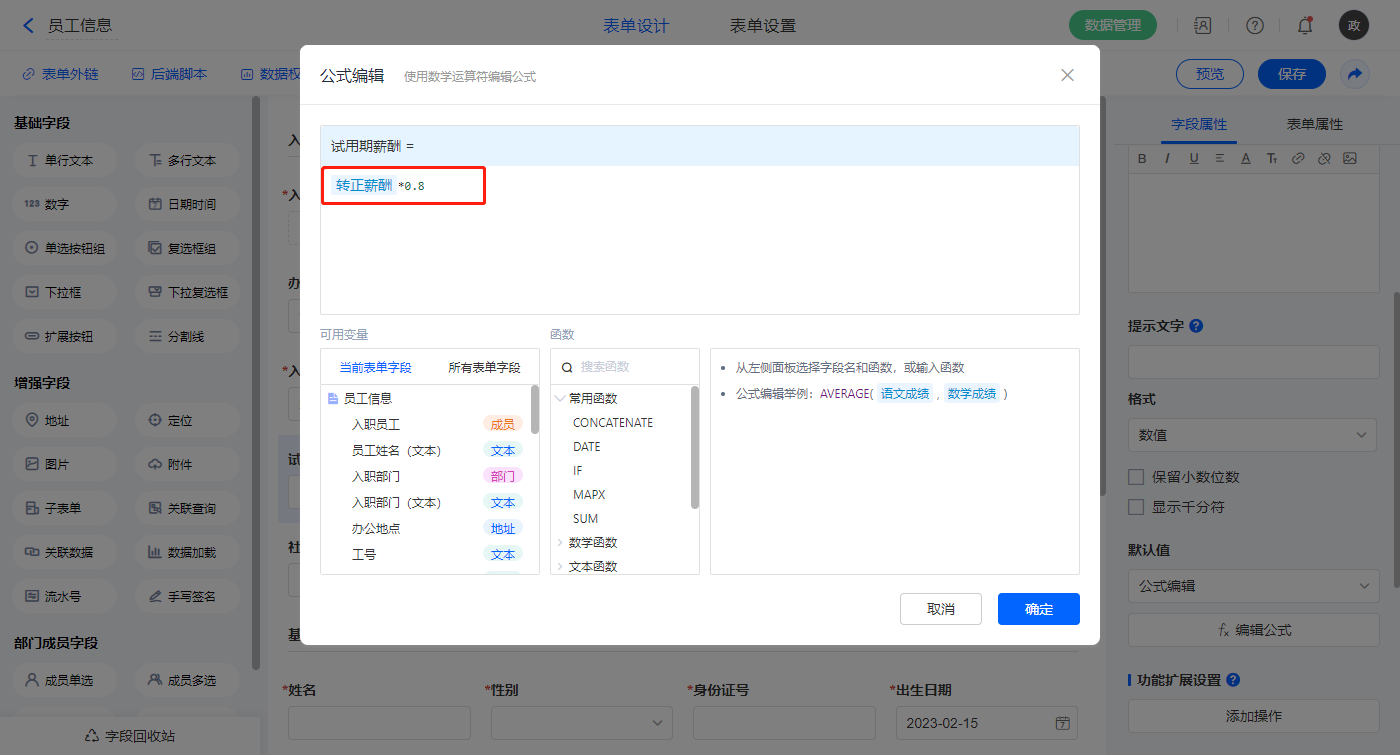 【试用期薪酬】字段,默认值选择公式编辑,如图设置公式;