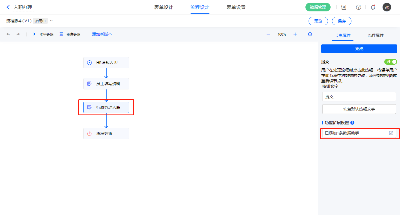 3)该表单是流程表单,设置流程节点行政办理入职,该节点属性的节点权限提交设置1条数据助手,名称为自动生成员工档案;