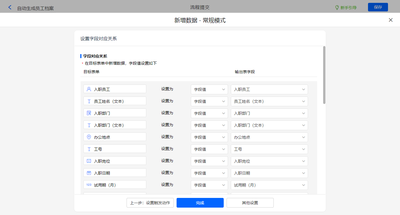 新增新增数据的执行动作,选择目标表单【人员信息】,选择对应字段,设置好点击【完成】并保存该数据助手;