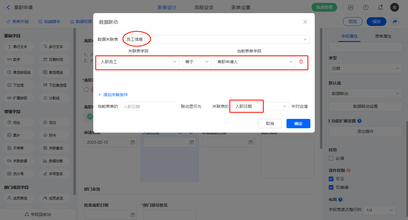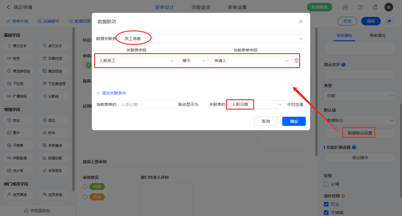 2)【入职日期】字段,设置默认值为数据联动,设置联动条件及联动字段;
