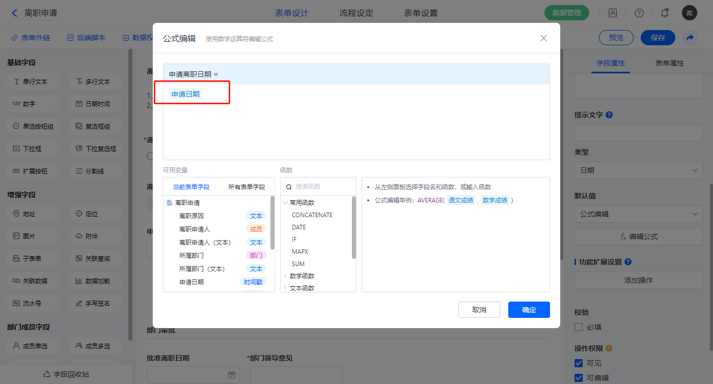 【申请离职日期】字段,设置默认值为公式编辑,如图设置公式;
