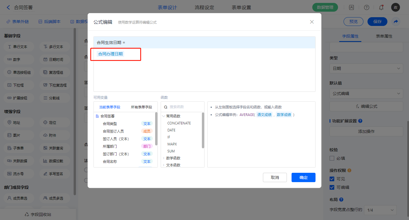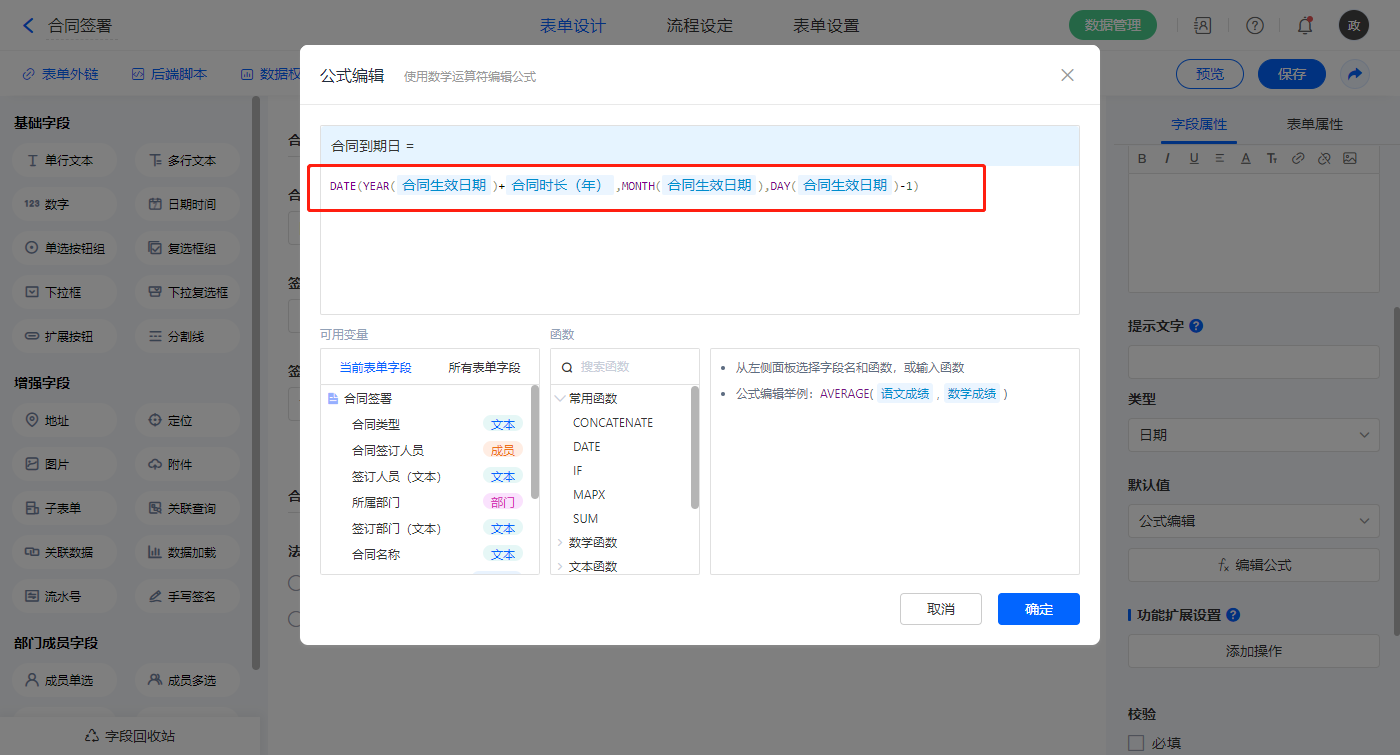 2)【合同生效日期】字段,设置默认值为公式编辑,如图设置公式;