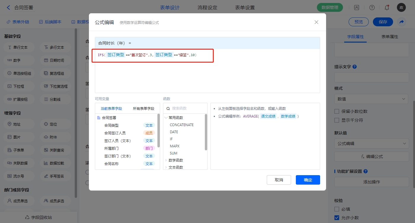 选择【合同时长(年)】字段,设置默认值为公式编辑,如图设置公式;
