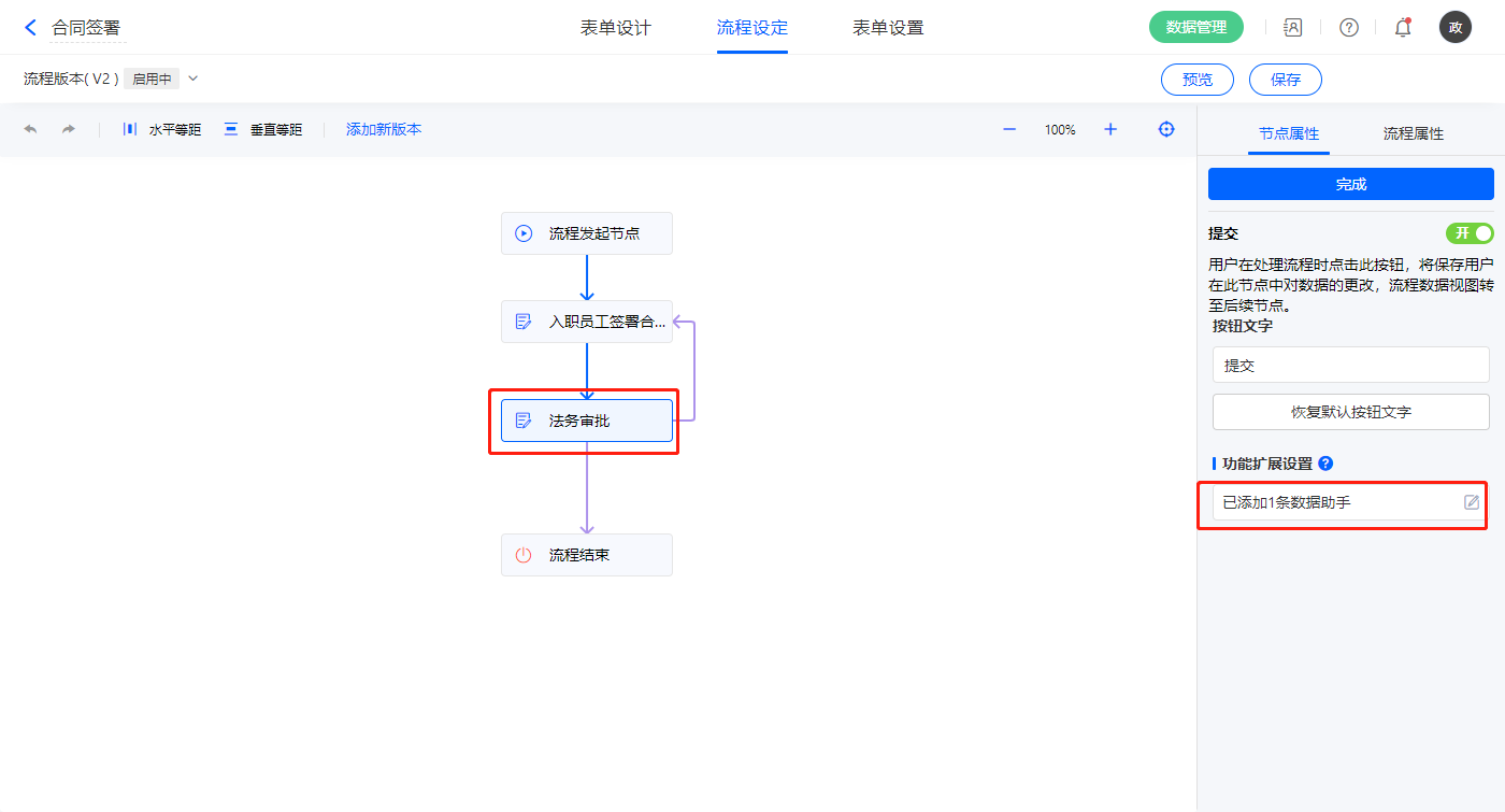 3)该表单是流程表单,设置流程节点法务审批,该节点属性的节点权限提交设置一条数据助手,名称为转正通过修改在职状态;