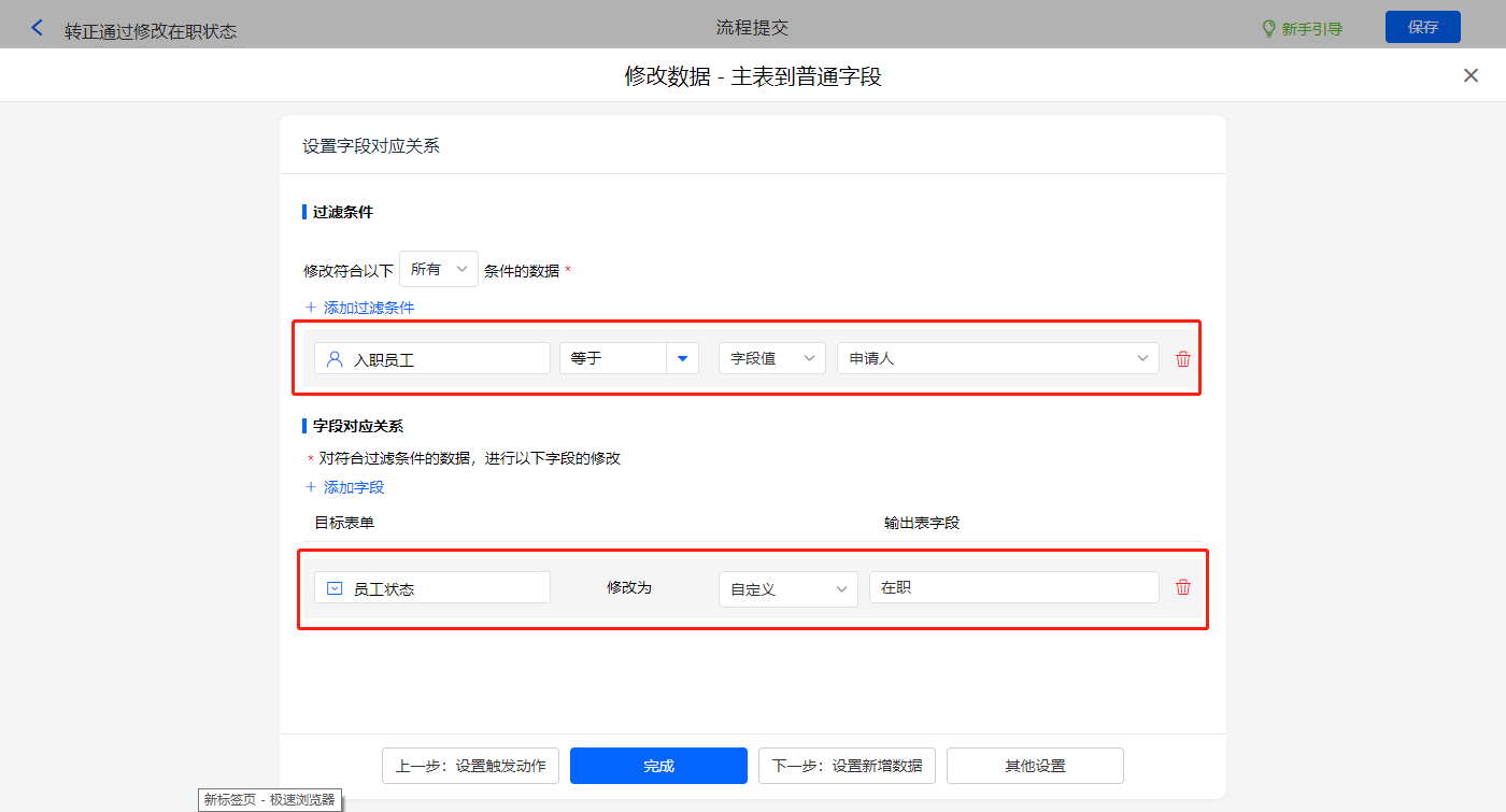 新增修改数据的执行动作,选择修改【人员信息】表单,选择对应过滤条件,以及需要修改的字段,设置好点击【完成】并保存该数据助手;